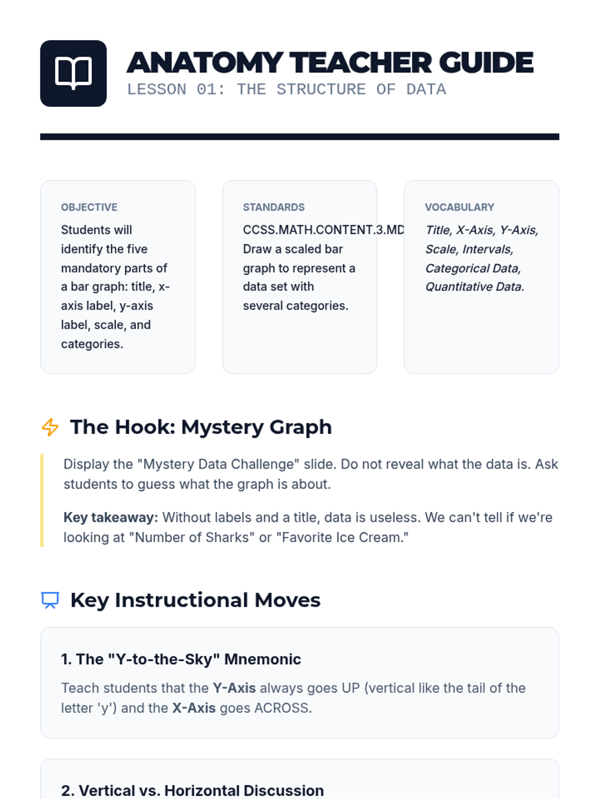 This sequence guides 3rd-grade students through the technical mastery of bar graphs. From identifying the anatomical parts of a graph to choosing appropriate scales and plotting data with precision, students develop the skills to represent data accurately in both vertical and horizontal formats.