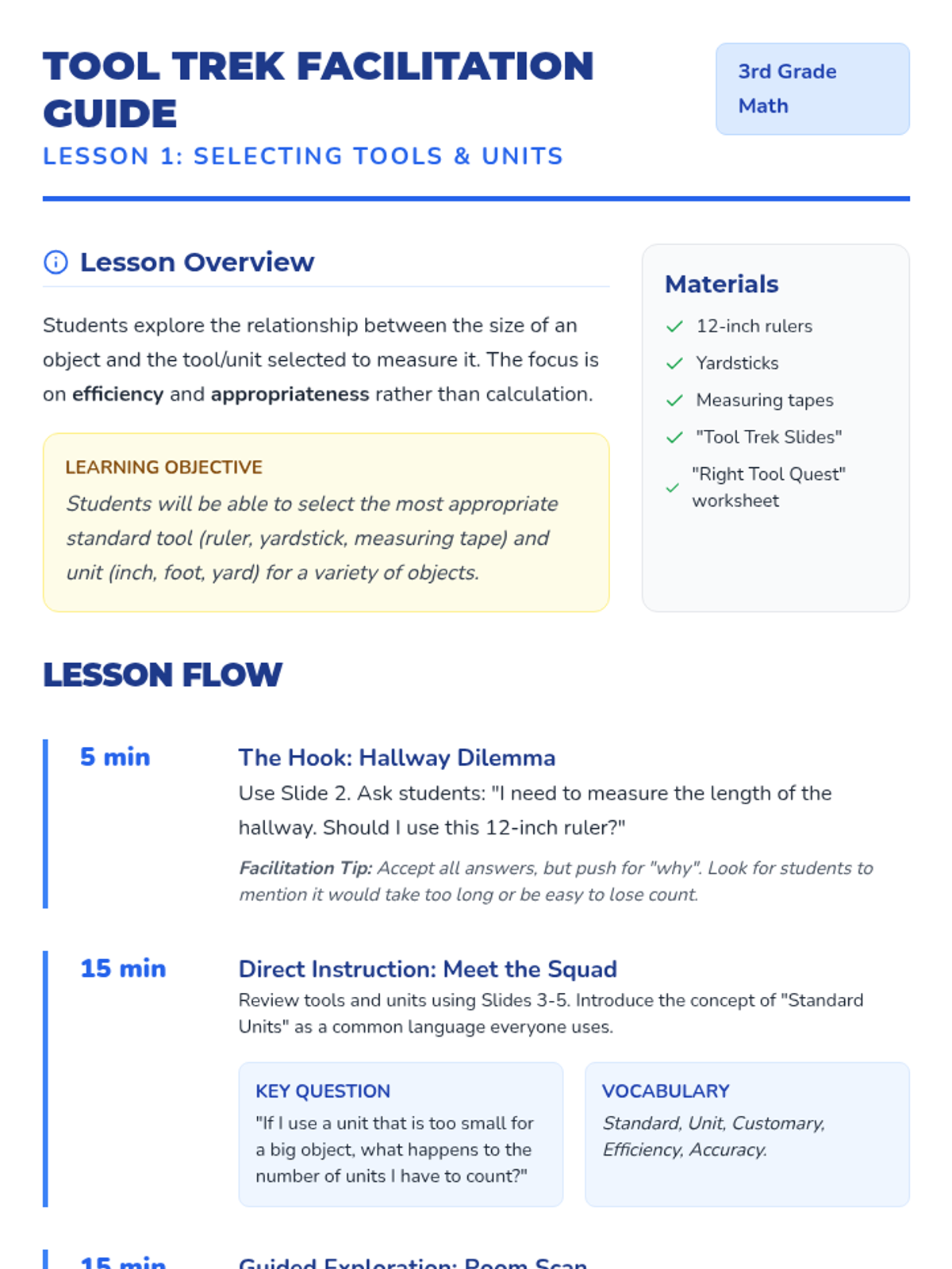 A 3rd-grade math unit focused on transitioning from small-scale measurements to large-scale estimation and measurement using metric and customary units. Students develop personal benchmarks, select appropriate tools, and complete a classroom mapping project.