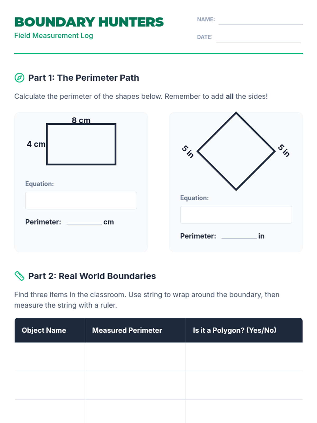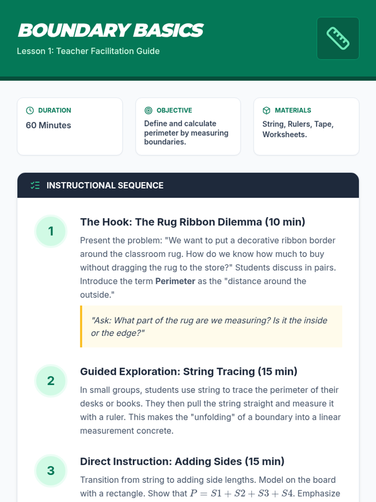 A comprehensive 3rd-grade unit on perimeter, moving from conceptual understanding of boundaries to calculating polygon perimeters, finding missing sides, and developing efficient formulas for rectangles.