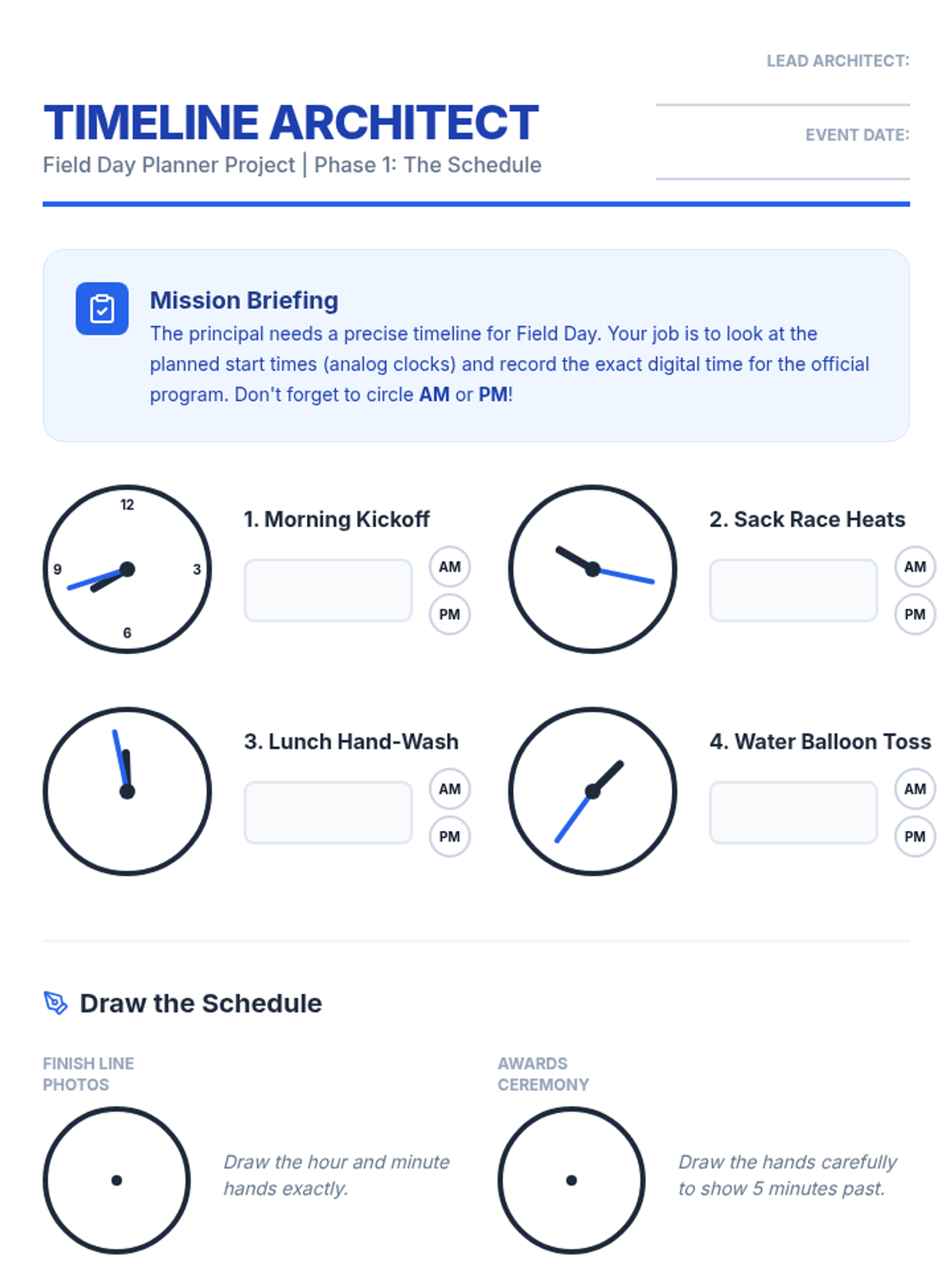 A simulation-based math unit where 3rd graders act as event planners for a Class Field Day. Students master telling time, calculating elapsed time, counting currency, and managing a budget through practical application.