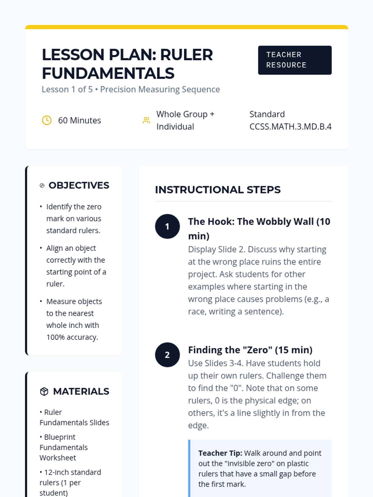 This 5-lesson sequence for 3rd graders focuses on developing precision and accuracy when measuring with standard rulers. Students progress from whole-inch fundamentals to halves and quarter-inch precision, culminating in a performance-based assessment.