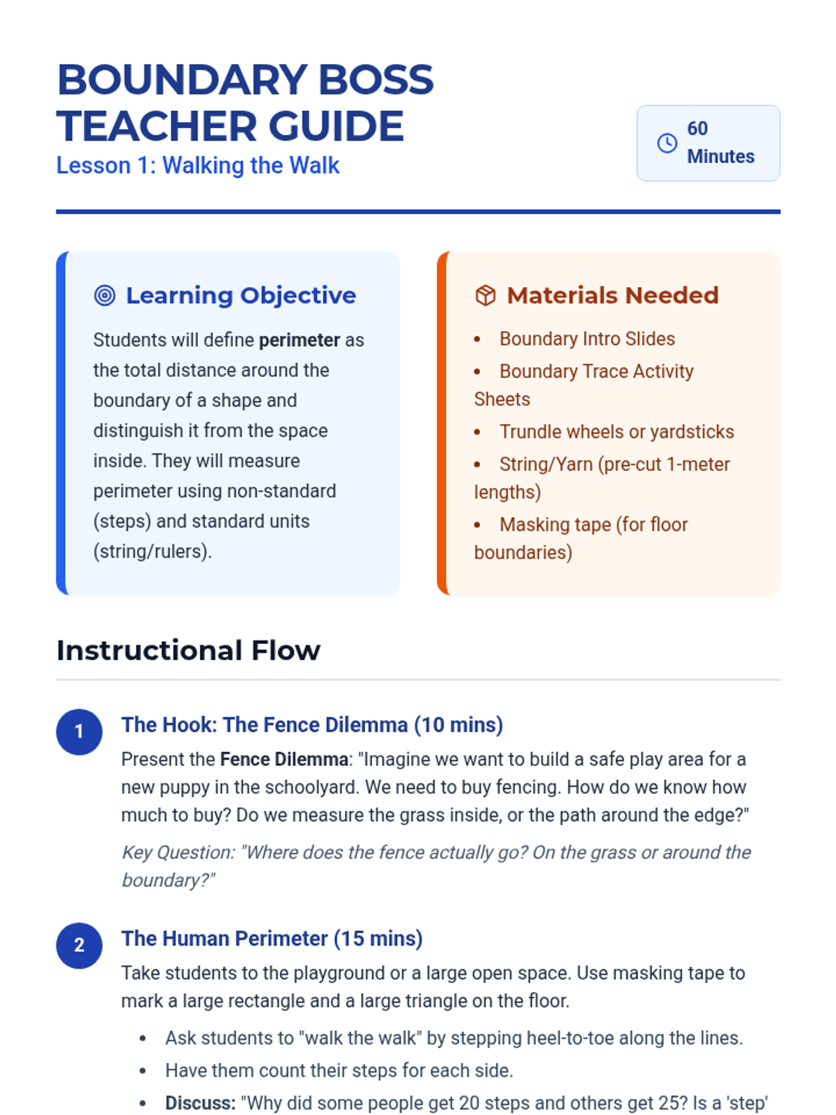 A project-based 3rd Grade math unit where students act as landscape architects to master perimeter and area. Through 5 lessons, students progress from measuring physical boundaries to designing a complex community garden blueprint, distinguishing between linear distance and 2-dimensional space.