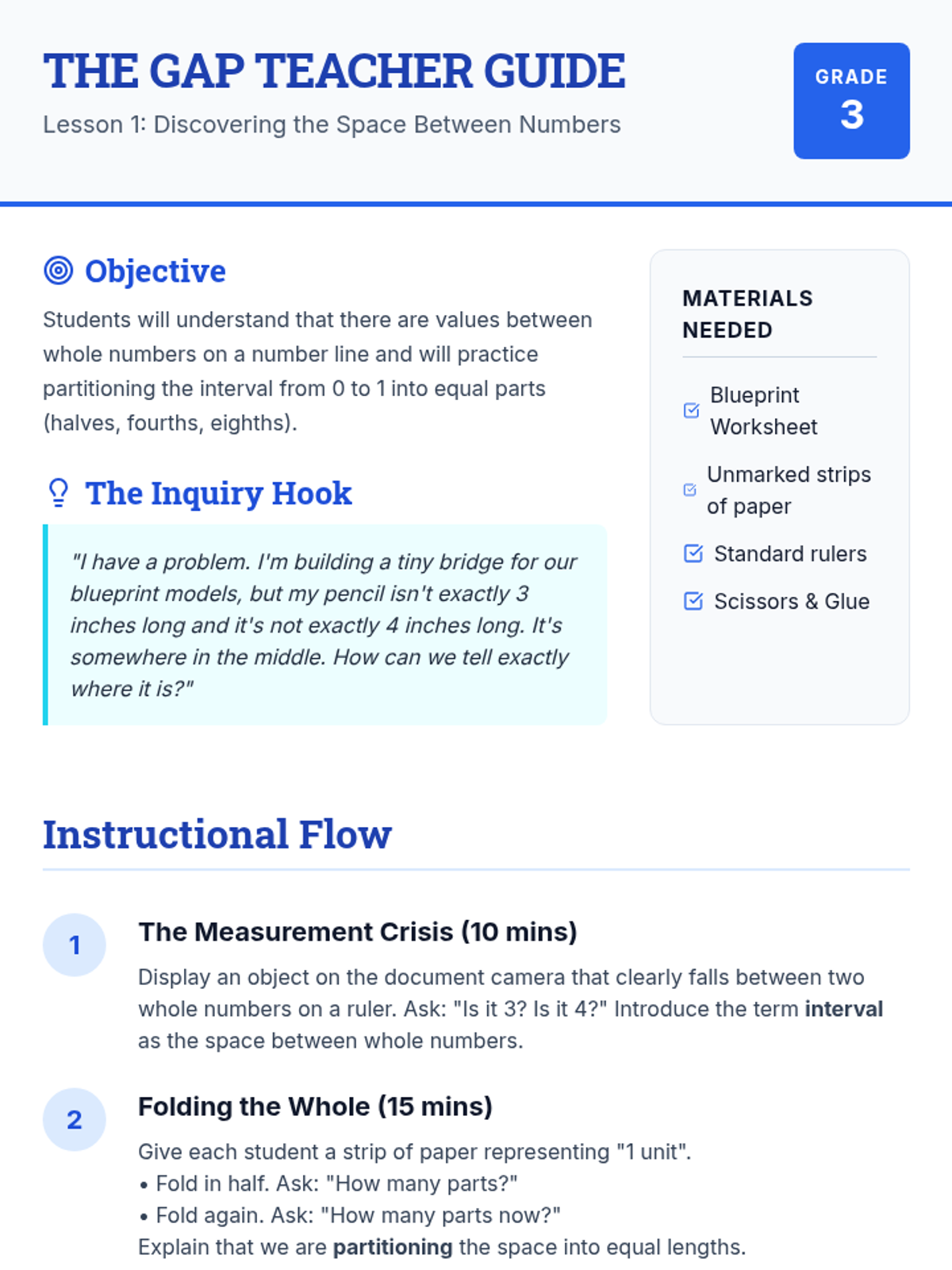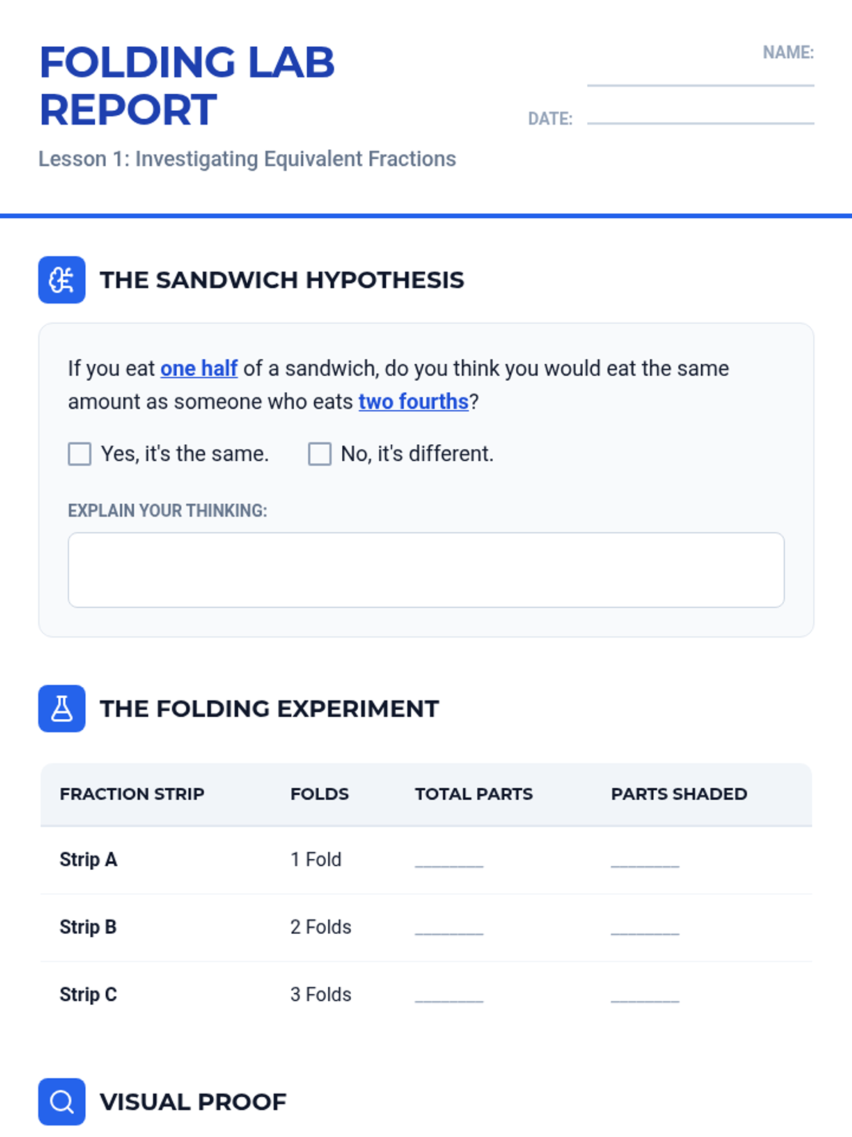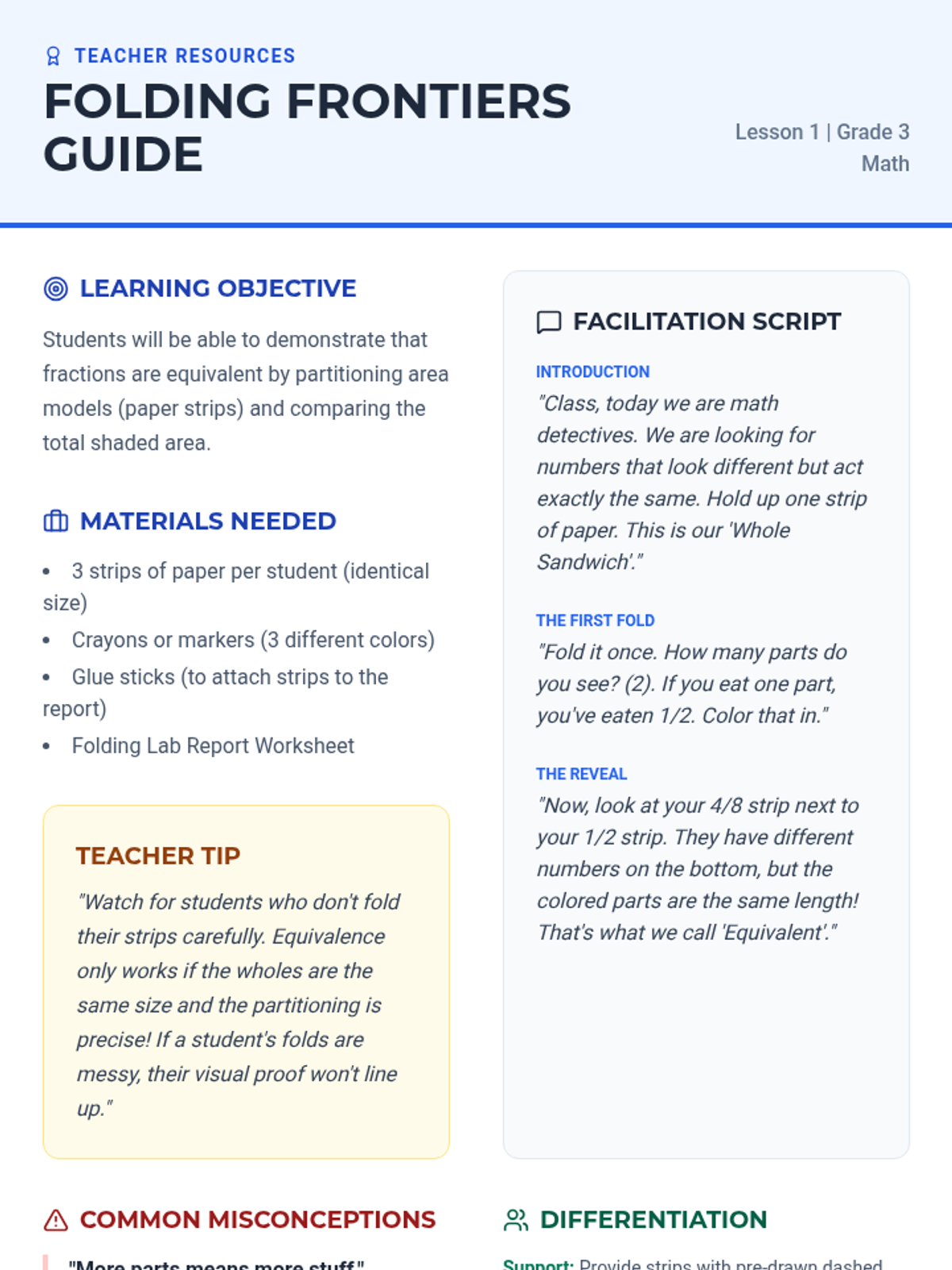 A 3rd-grade math sequence focused on building a deep conceptual understanding of fraction equivalence through paper folding, fraction strips, area models, and numerical pattern recognition. Students progress from concrete manipulation to abstract pattern identification, culminating in a creative museum exhibit project.