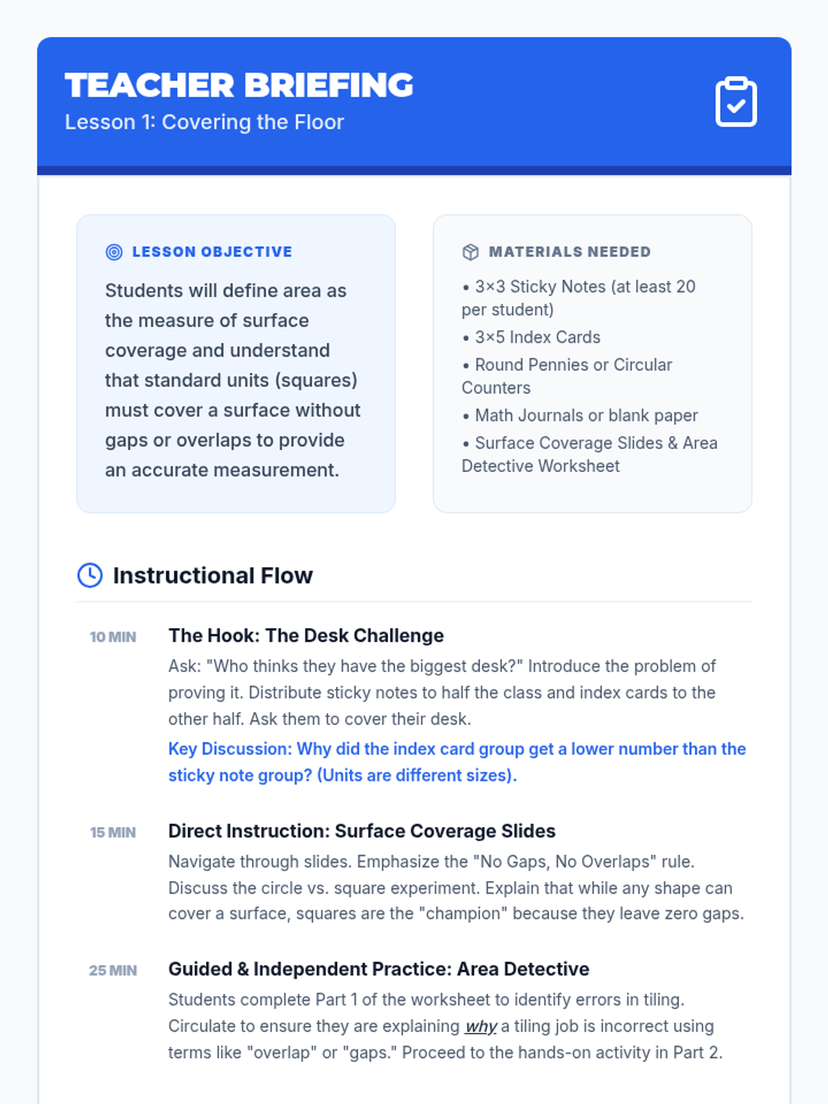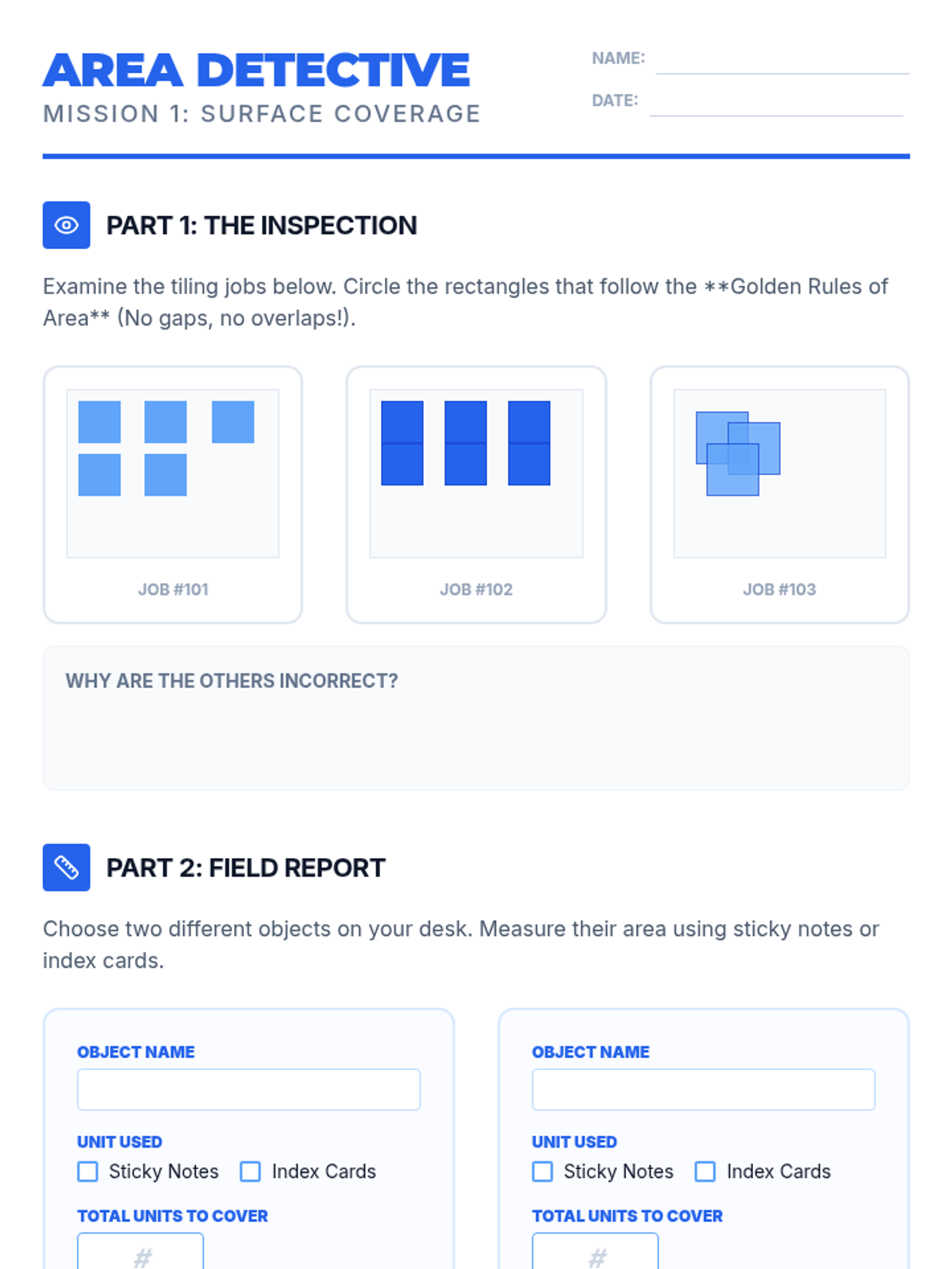 A 5-day unit exploring area through the lens of architectural design. Students move from physical tiling to multiplication and finally to decomposing complex rectilinear shapes, aligned with Arizona 3.MD.C.7 standards.