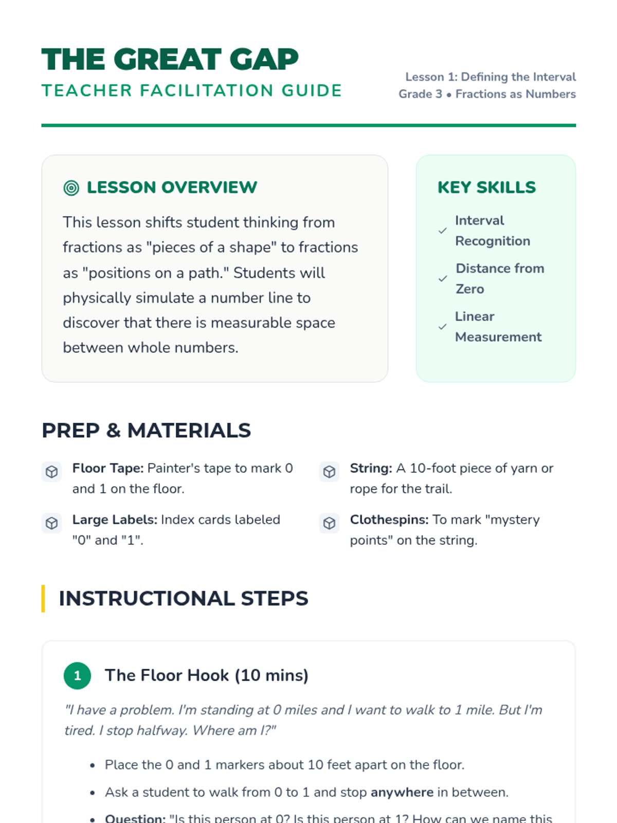 A specialized sequence for 3rd-grade students focusing on using number lines as visual cognitive scaffolds. Students progress from physical movement on a floor-sized line to using 'open' number lines for addition, subtraction, elapsed time, and fractions, providing a consistent strategy for solving complex problems.