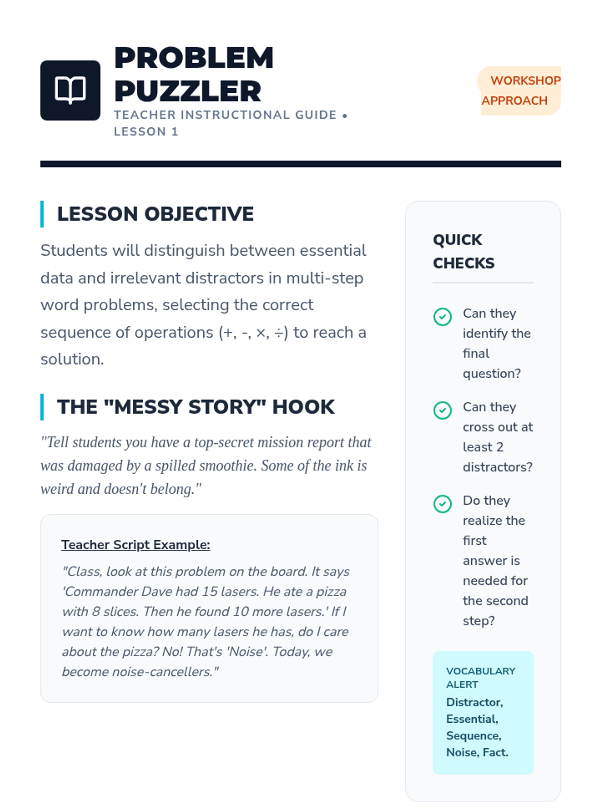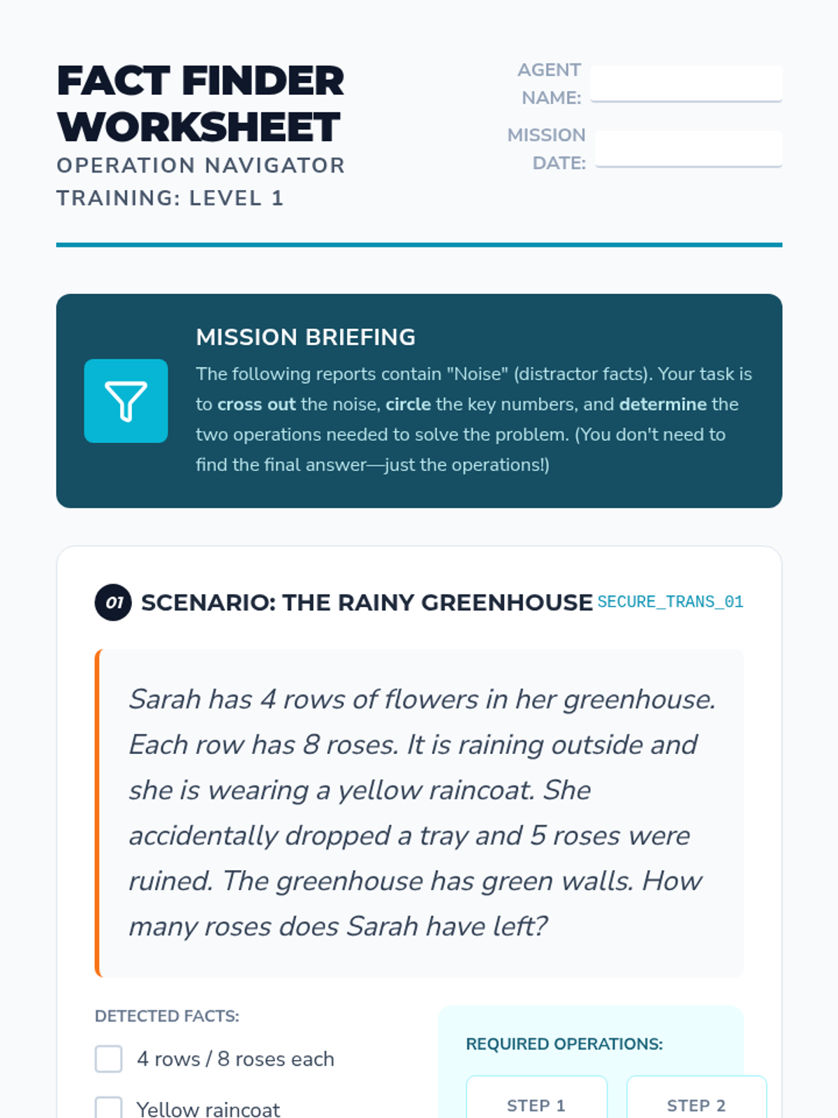 A comprehensive 3rd-grade math sequence where students become 'Operations Navigators' to master two-step word problems. Students progress from deconstructing messy word problems to modeling solutions with bar diagrams, introducing variables, and applying the order of operations in a final mission simulation.