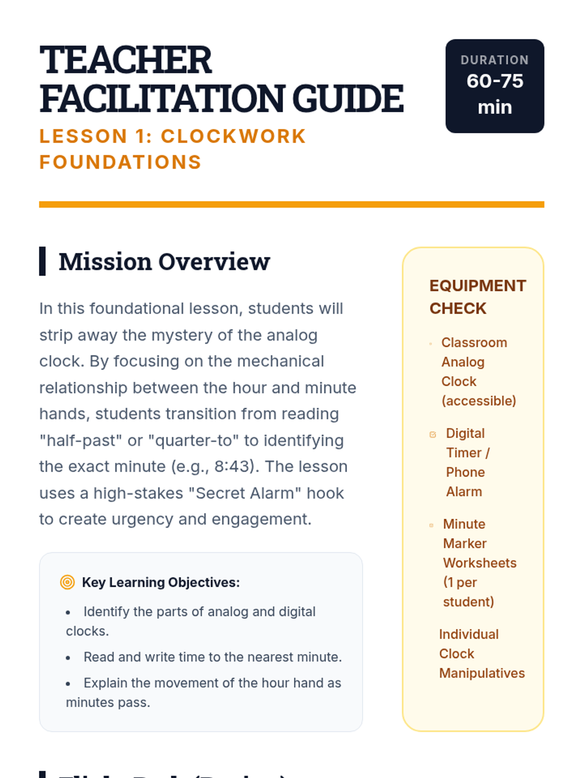 A comprehensive 3rd-grade math unit focusing on reading analog clocks to the minute, calculating elapsed time using number lines, and solving complex time-based word problems. Students progress from basic clock reading to designing their own optimized daily schedules.