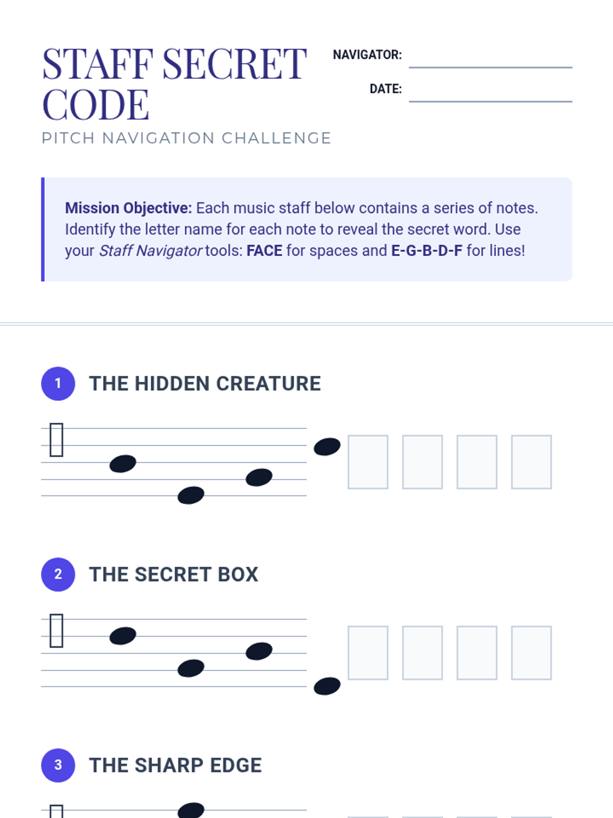A comprehensive sequence for 4th-grade music students to master reading pitch on the treble clef staff. Students progress from basic staff geography to identifying notes, recognizing intervals, and finally sight-reading simple melodies on instruments.