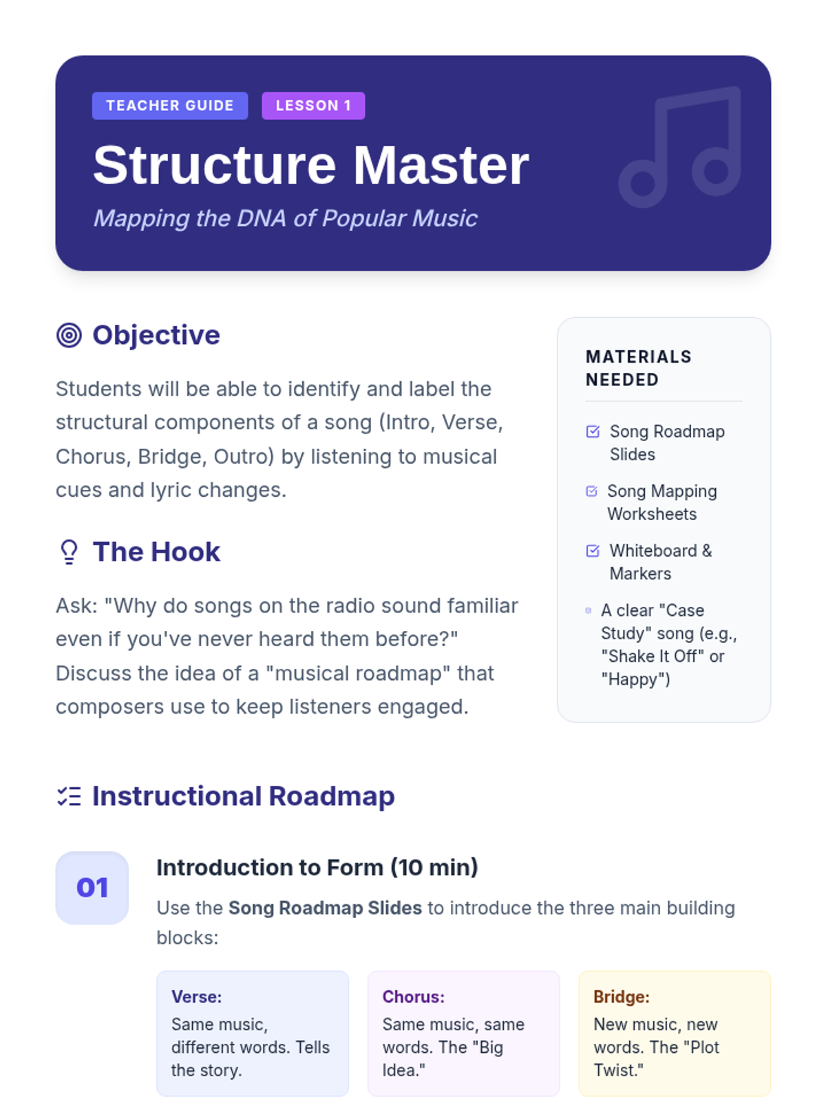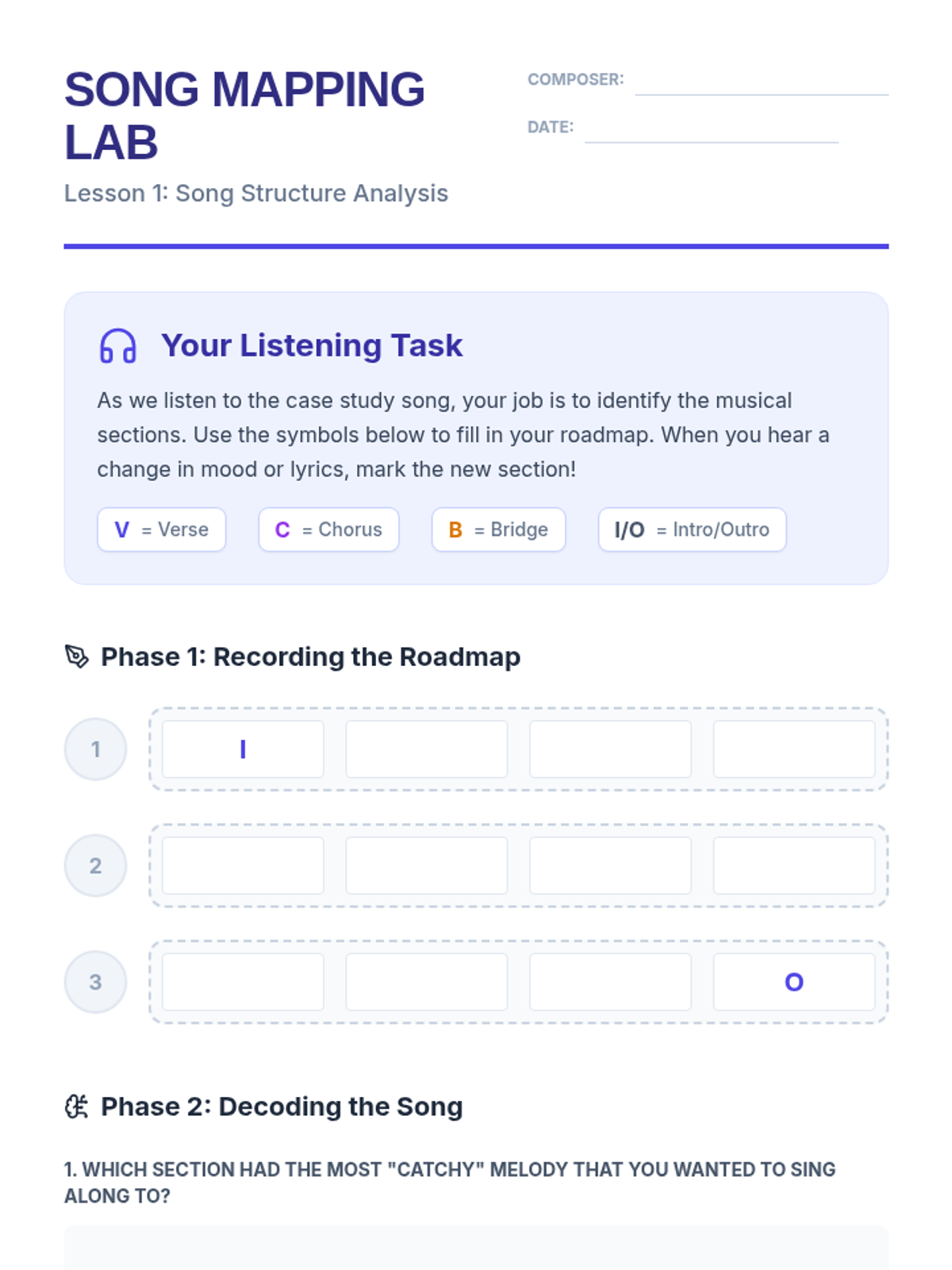 A 4th-grade music sequence that guides students through the songwriting process, from analyzing song forms to composing original lyrics and adding harmonic accompaniment. Students explore the synergy between storytelling and musical structure.