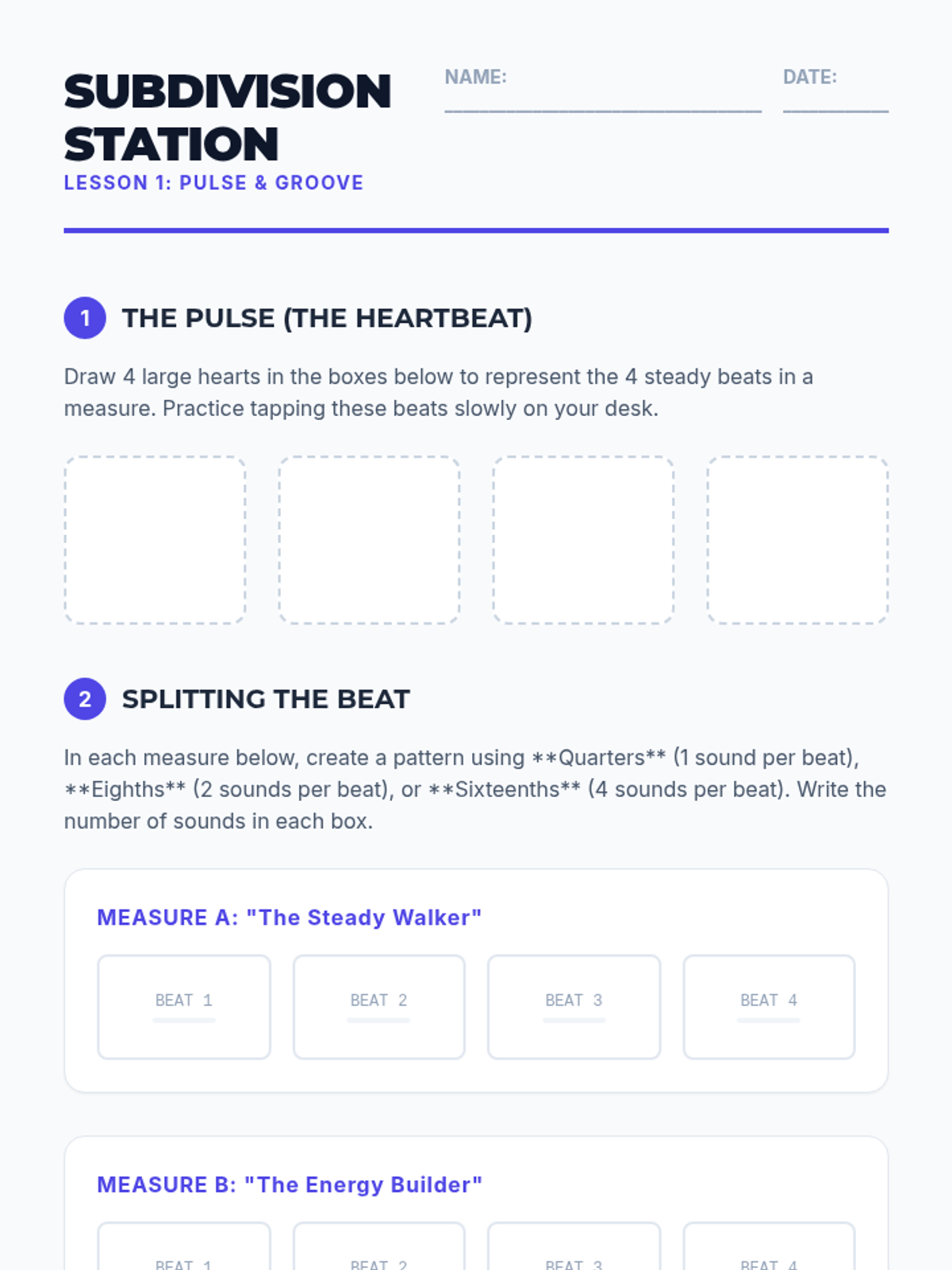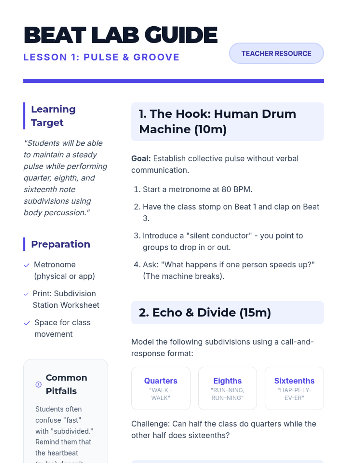 A high-energy, interactive unit focused on mastering rhythm and tempo through digital gameplay and body percussion, designed specifically for paperless classrooms.