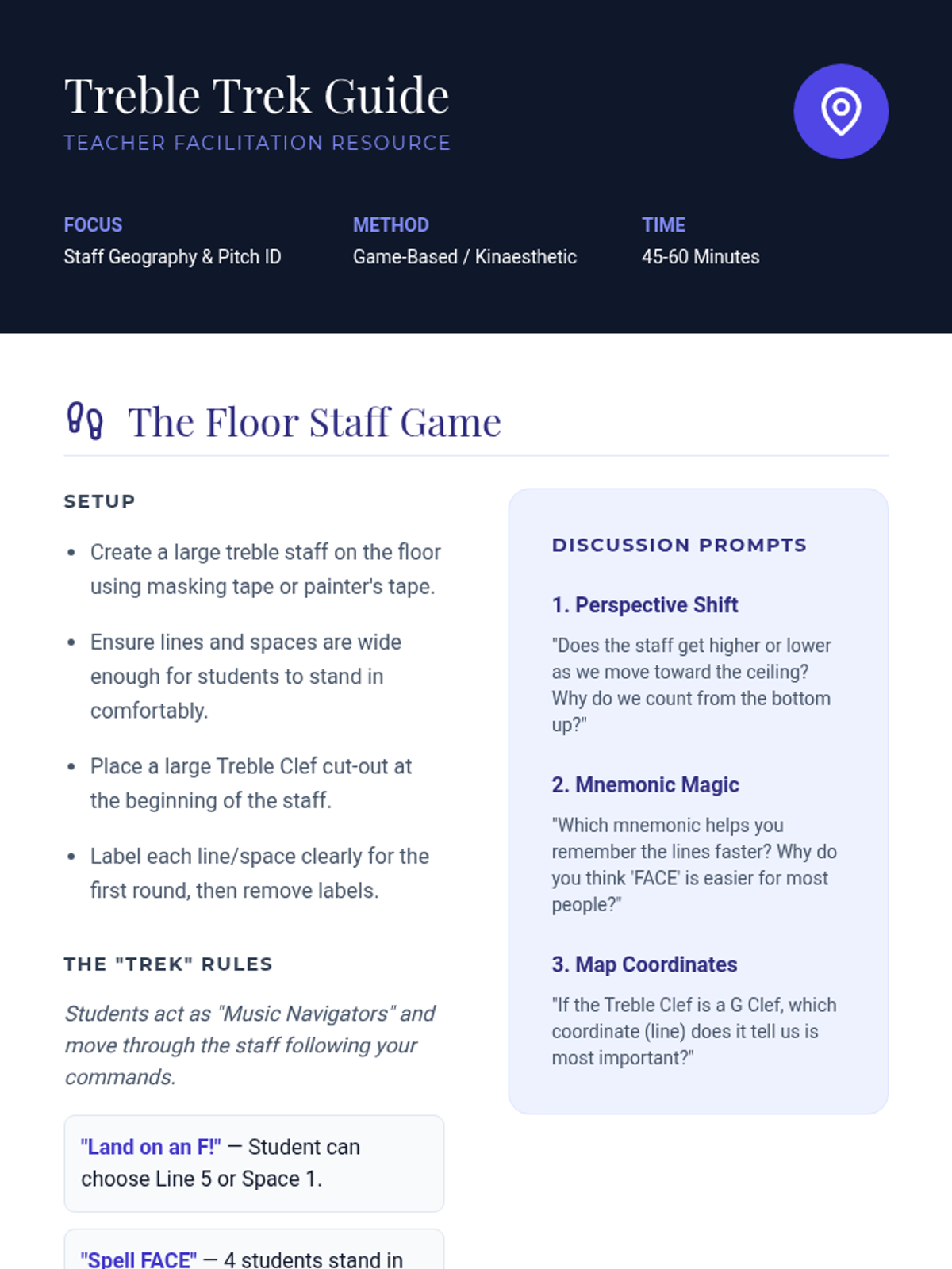 A comprehensive sequence for 4th-grade music students to master reading melodic notation on the treble clef. Students progress from basic staff geography to performing simple melodies on instruments, bridging the gap between visual symbols and physical performance.