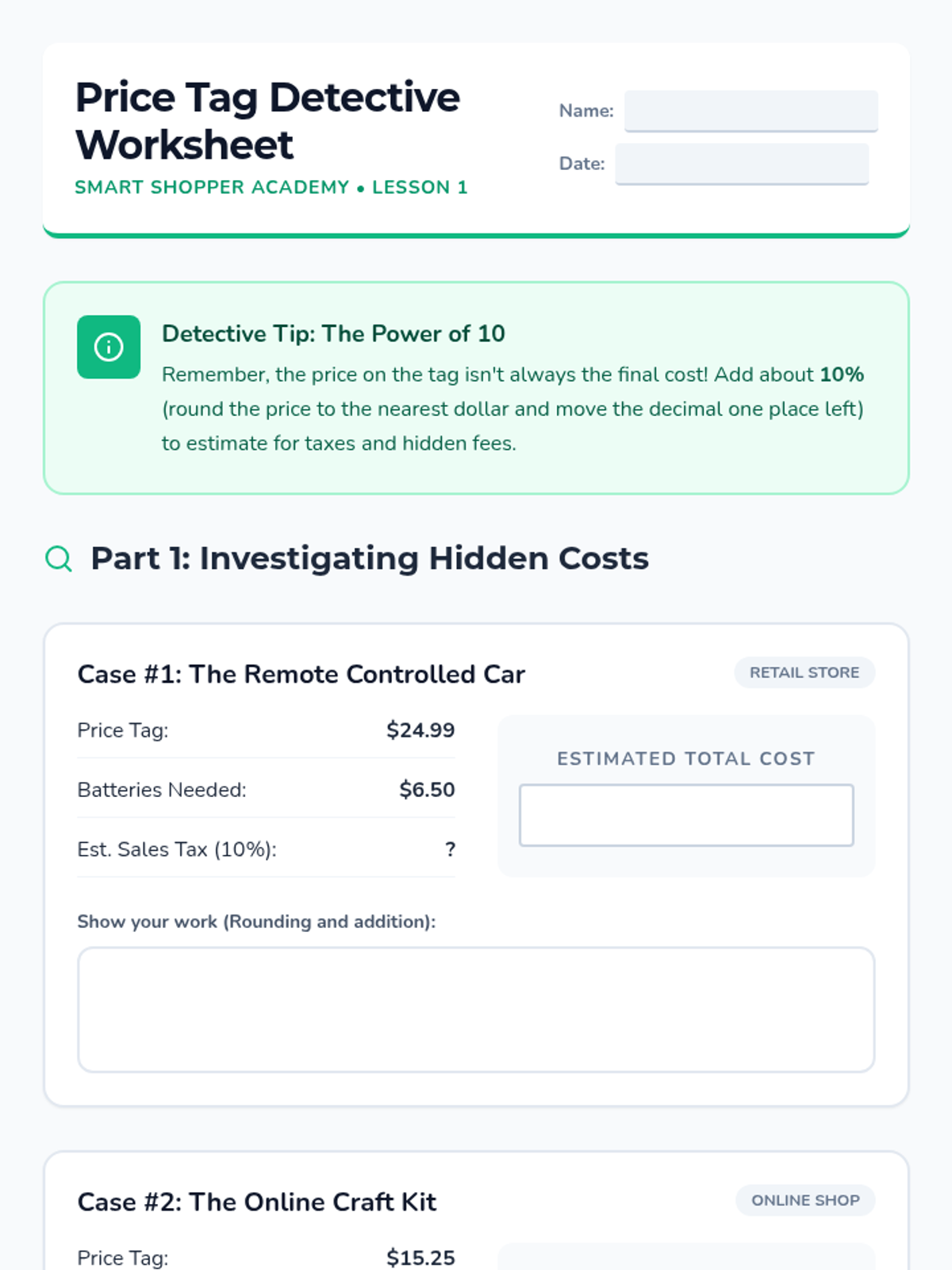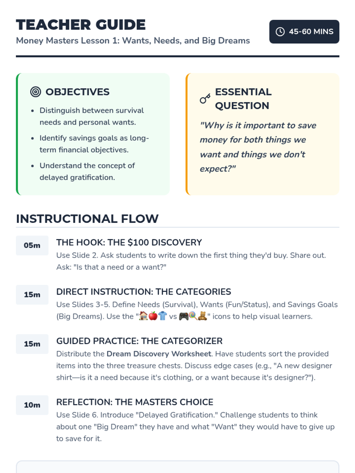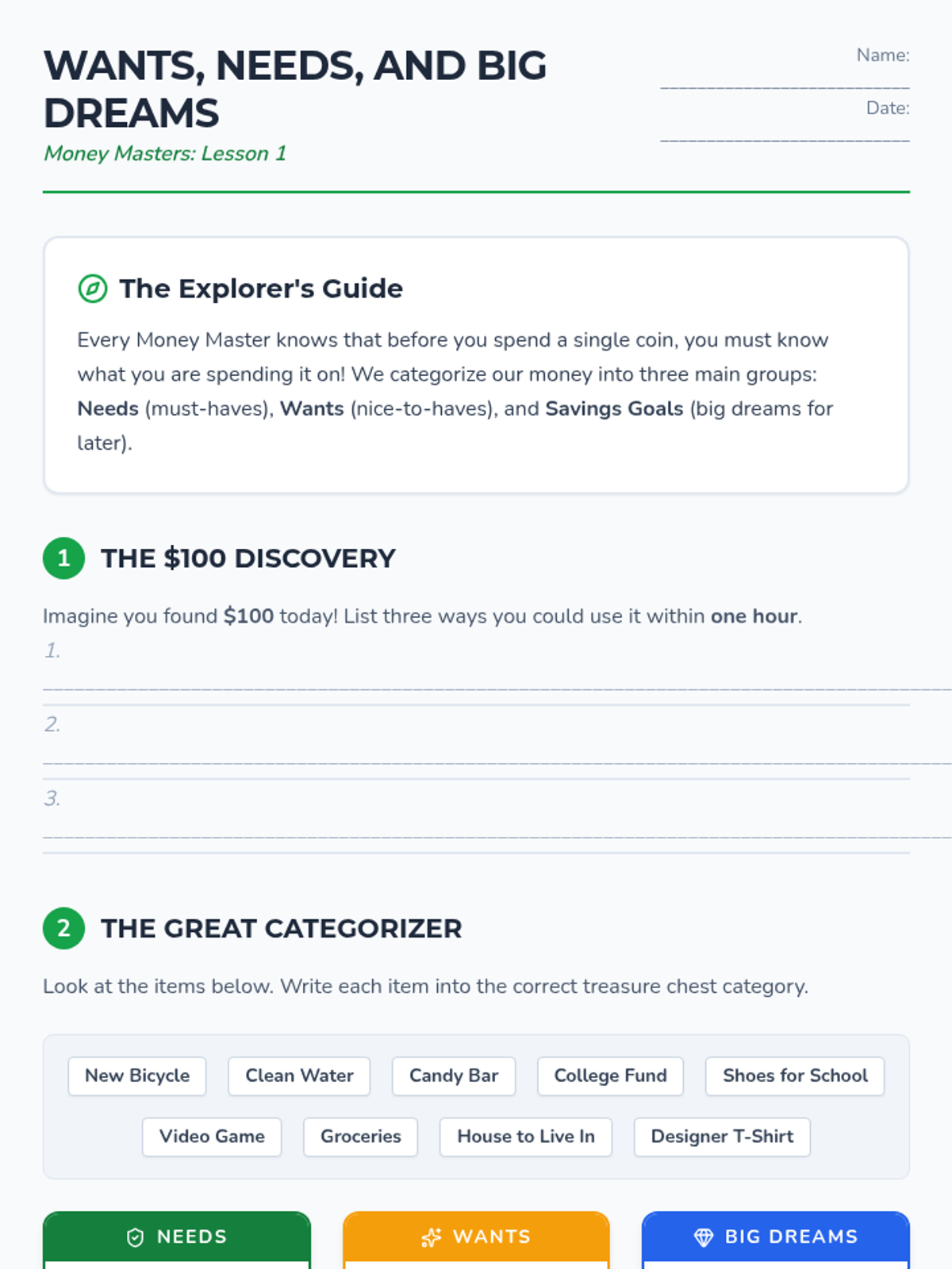 A comprehensive 5-lesson unit that transforms 4th-grade students into critical consumers. Students learn to distinguish needs from wants, deconstruct advertising tricks, use math to find the best value, spot marketplace scams, and create a justified spending plan.