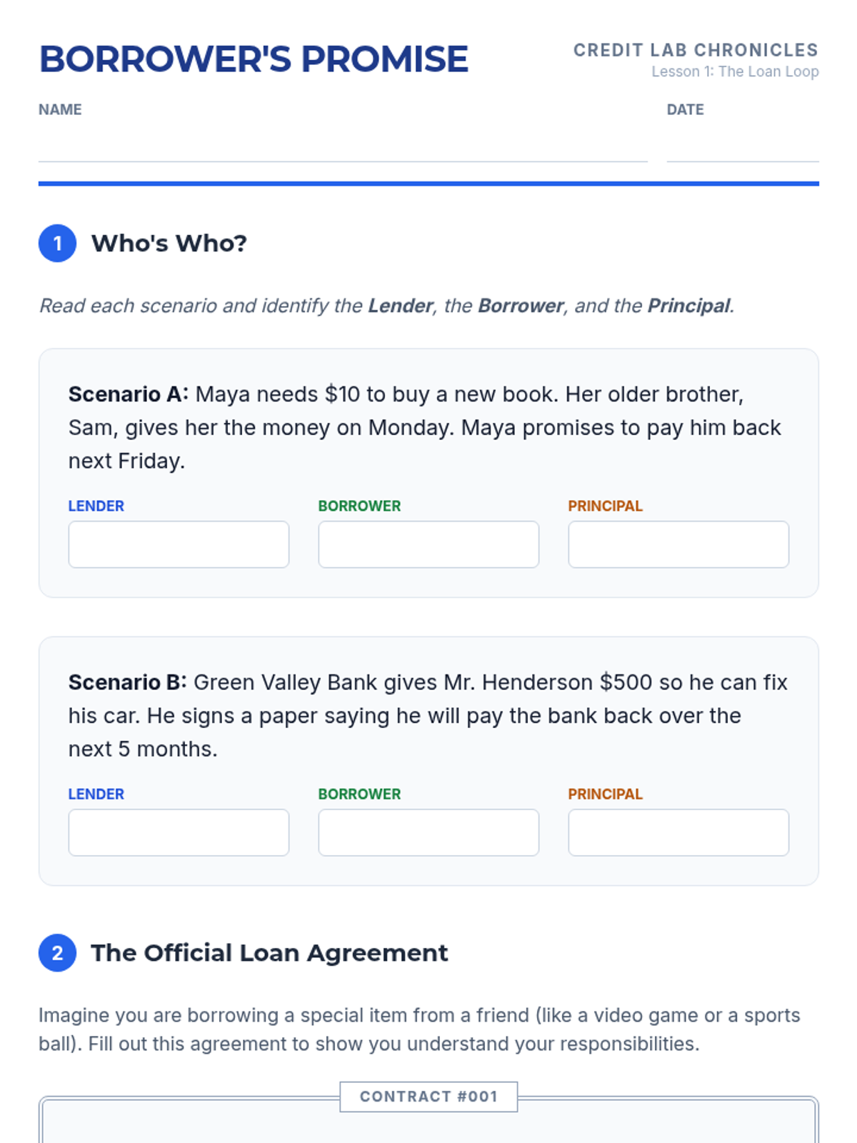 A 4th-grade economics simulation exploring the mechanics of borrowing, lending, and credit. Students transition from savers to lenders and borrowers, learning about interest rates, creditworthiness, and the responsibilities of financial agreements.