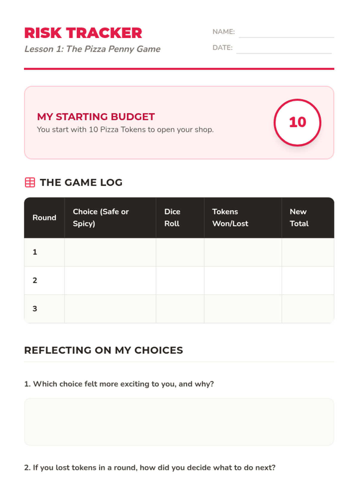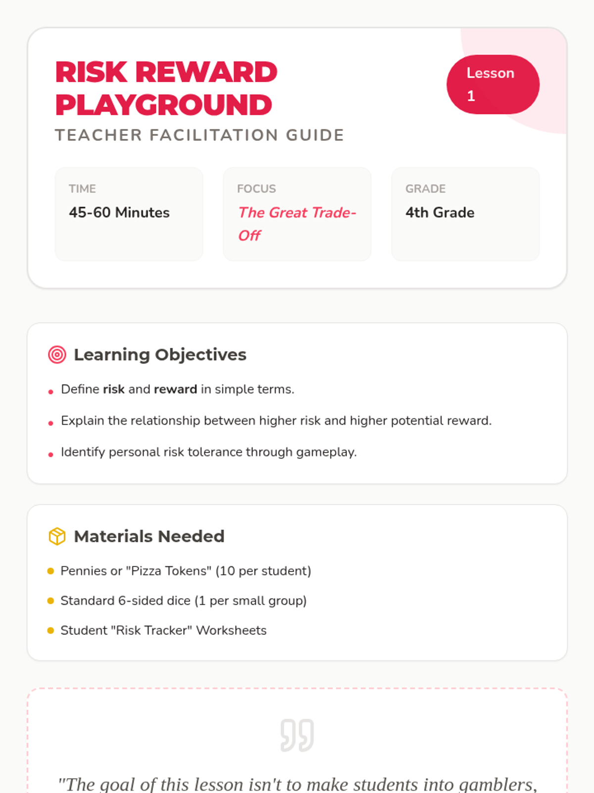 A comprehensive 5-lesson unit for 4th graders exploring risk, stocks, bonds, and diversification through the engaging metaphor of a pizza shop. Students learn how to balance safety and growth to build a resilient 'Financial Pizza' portfolio.