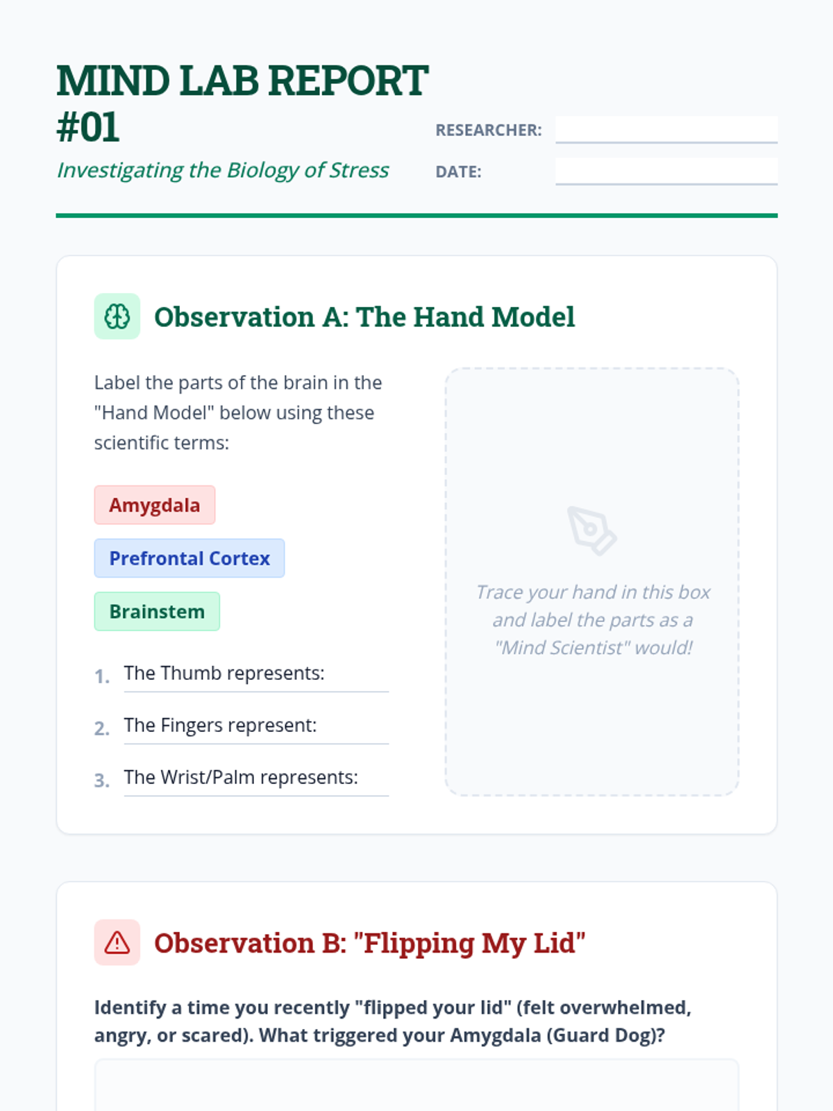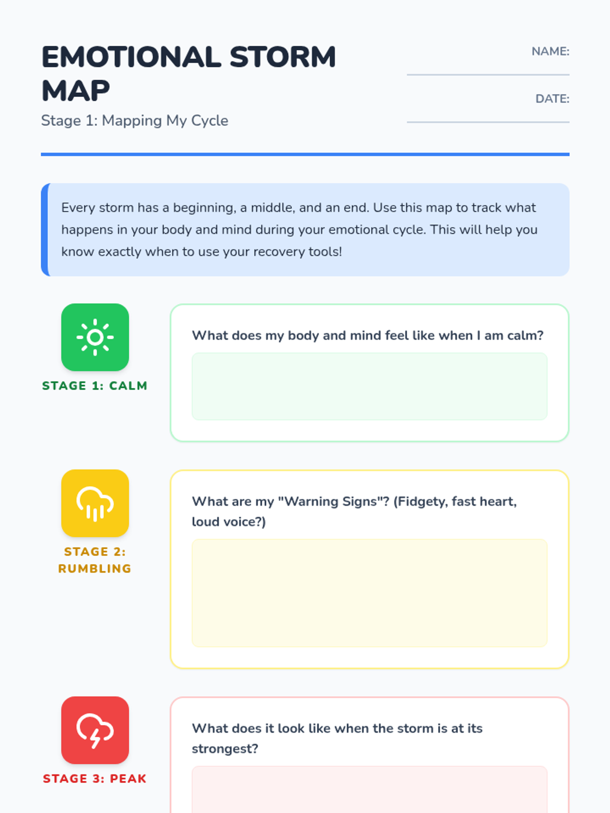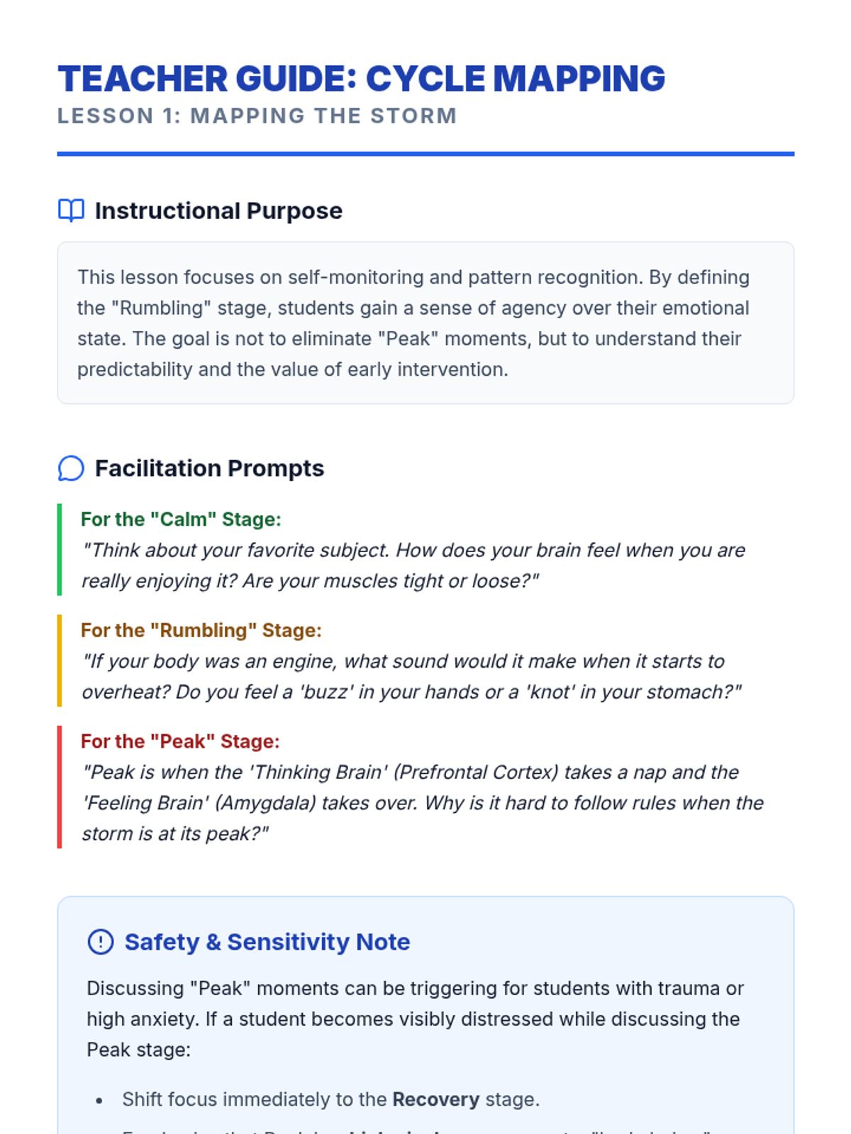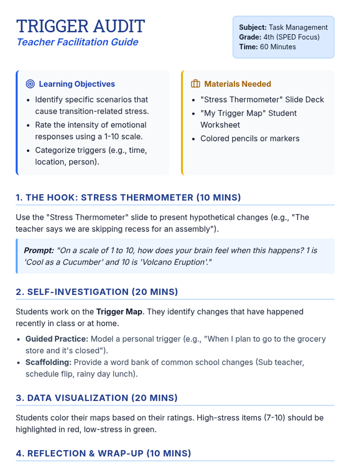 A culminating 5-lesson project-based sequence where 4th grade students design a Personal Recovery Plan (PRP). Students map their emotional cycles, assemble sensory toolkits, script their return to the classroom, and create visual guides for self-regulation and recovery.