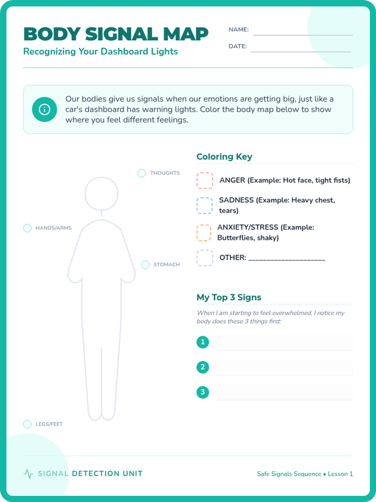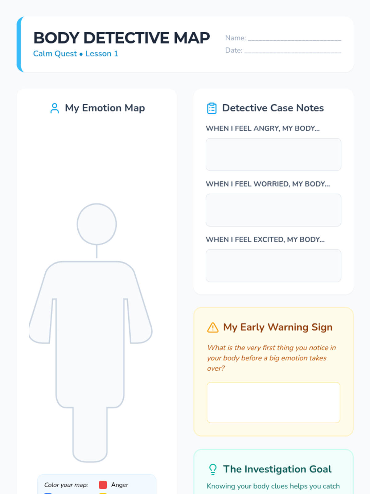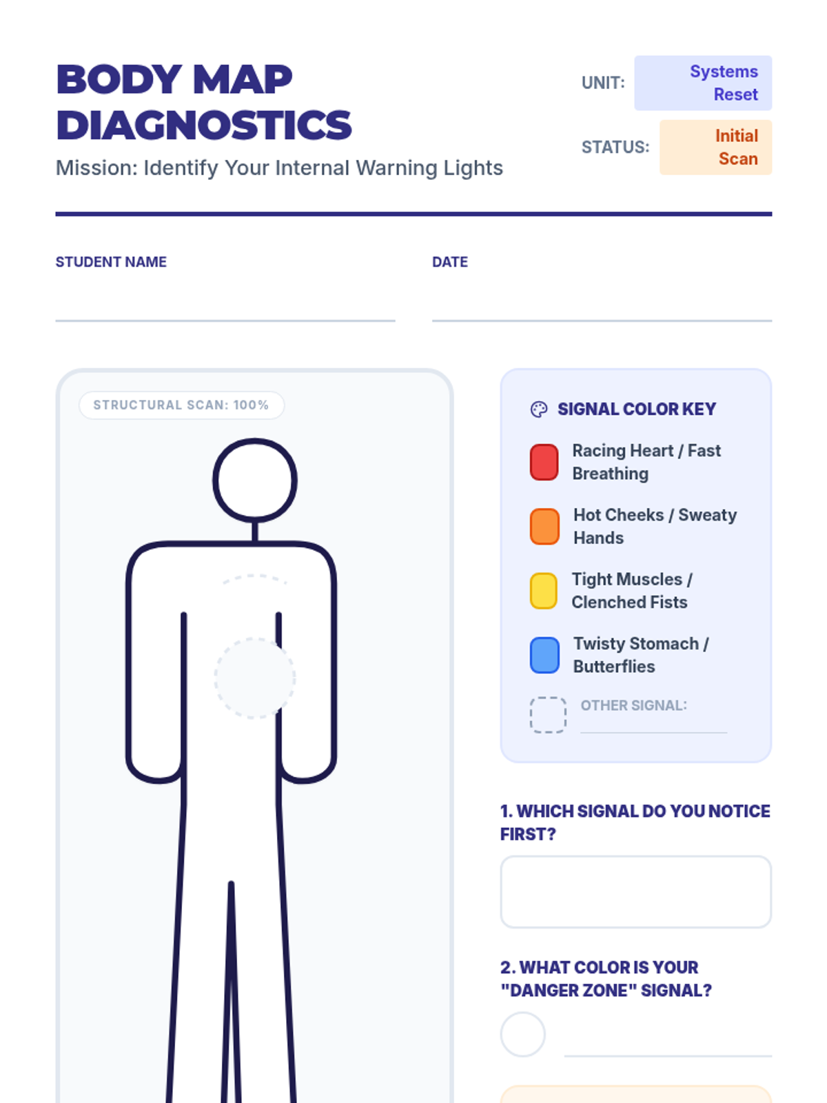 A comprehensive 5-lesson unit for 4th graders focused on identifying physiological stress signals, understanding emotional triggers, practicing grounding techniques, and developing a personal safety plan with a support network.