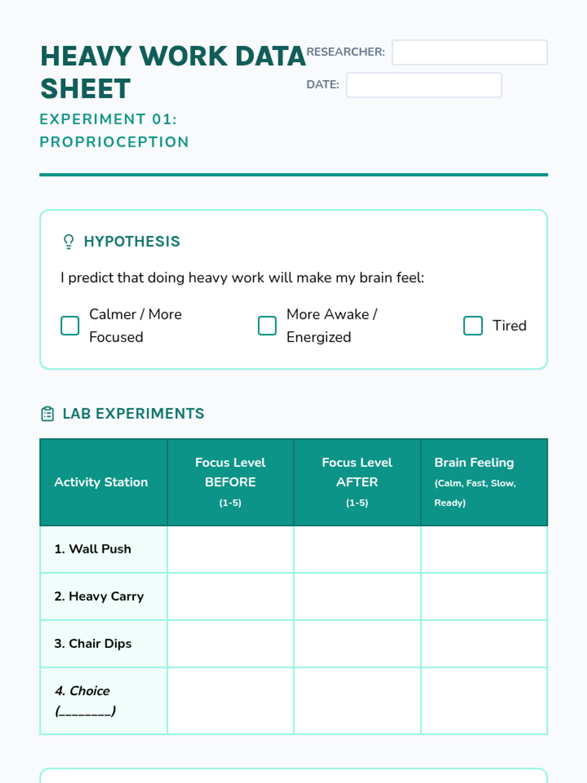 A hands-on, workshop-style sequence where 4th grade students experiment with various sensory strategies to discover what helps them regulate their nervous systems. Students act as 'Sensory Scientists,' collecting data on proprioceptive, vestibular, tactile, visual, and auditory tools to create a personalized 'Regulation Menu.'