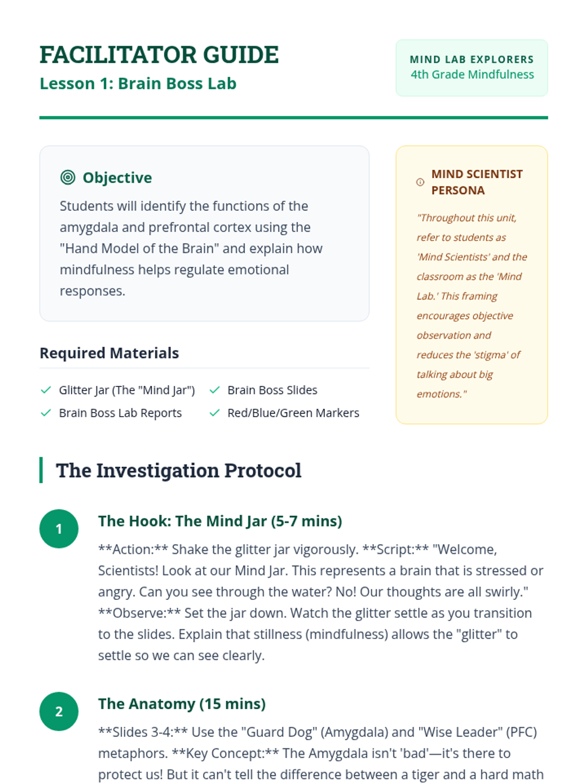 An inquiry-based mindfulness sequence for 4th graders, framing students as 'Mind Scientists' who investigate the neuroscience of stress, the power of sensory attention, and the practice of non-judgmental observation. Students explore the brain-body connection through sound, visualization, movement, and somatic awareness.
