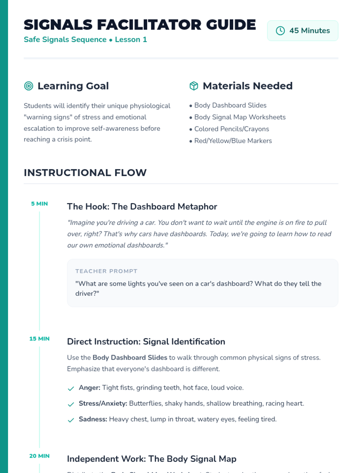 A comprehensive 5-lesson sequence designed to teach 4th-grade students self-regulation through daily emotional check-ins, goal setting, and non-verbal communication. Students learn to identify their internal state using a battery metaphor and connect it to their readiness for learning.