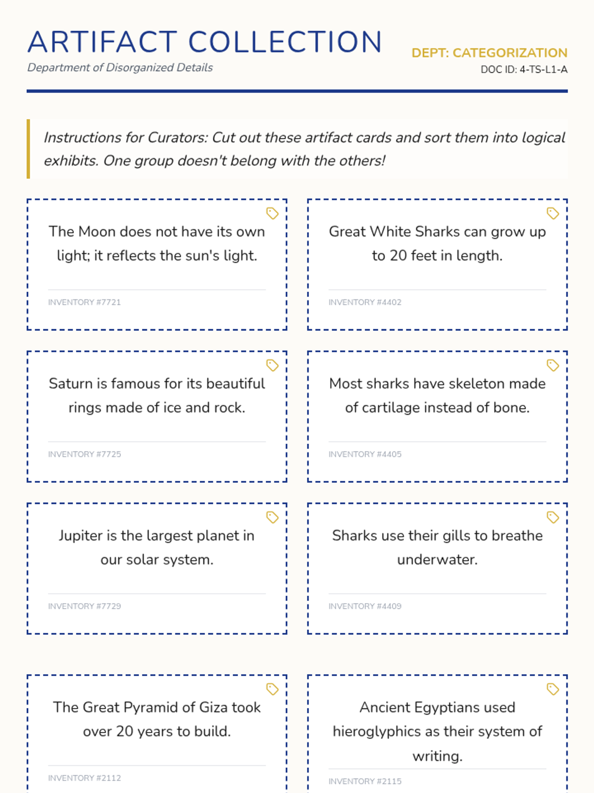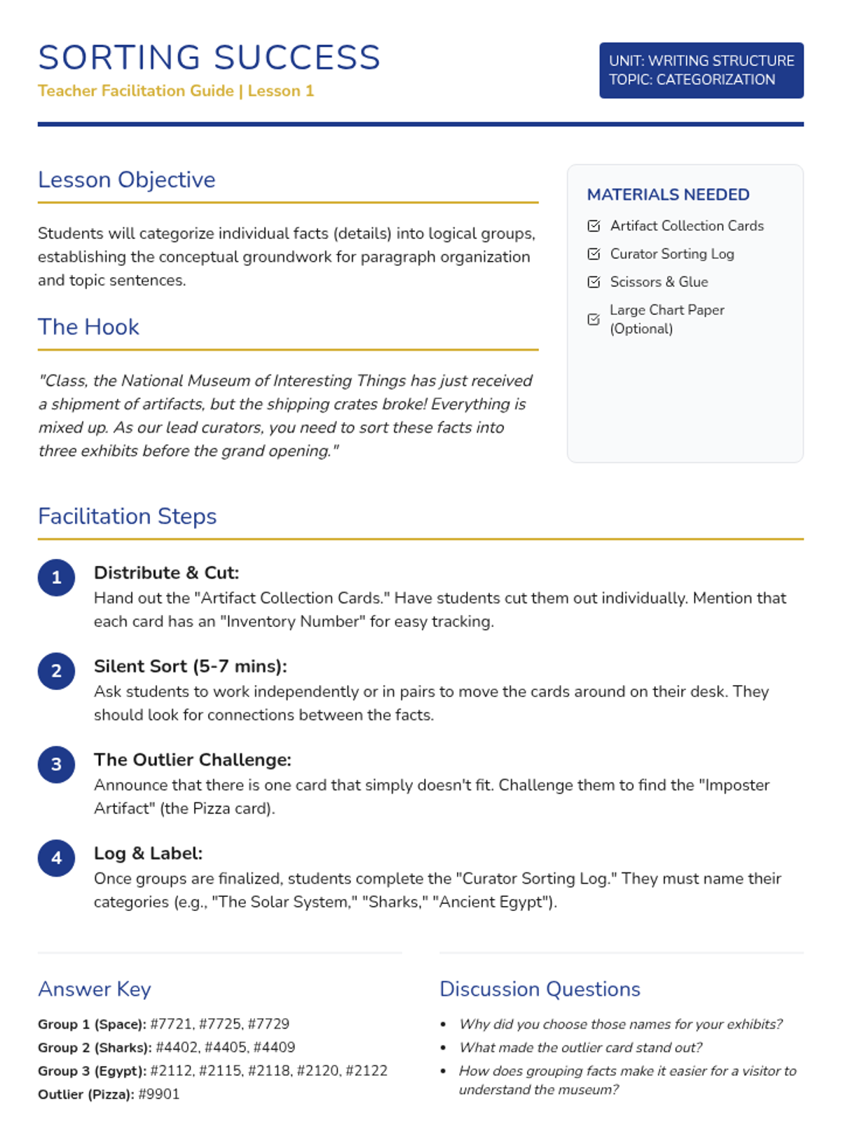 A 4th-grade writing sequence where students act as museum curators to master topic sentences and thesis statements through sorting, labeling, and organizing information.