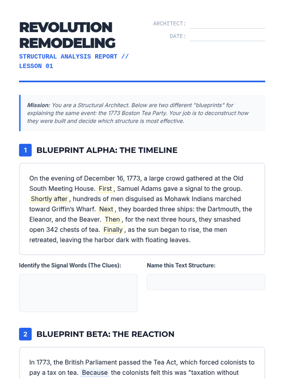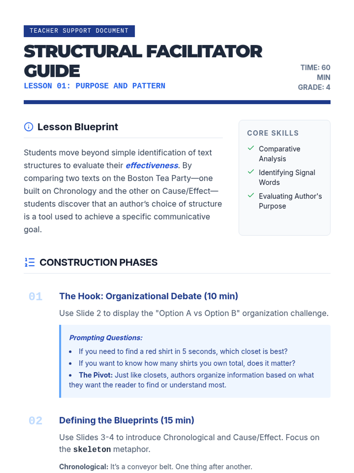 A 4th-grade inquiry-based unit exploring why authors select specific text structures (Chronological, Cause/Effect, Problem/Solution, Description, and Sequence) to convey information in science and history. Students analyze effectiveness, evaluate clarity, and debate the best structural choices for various topics.