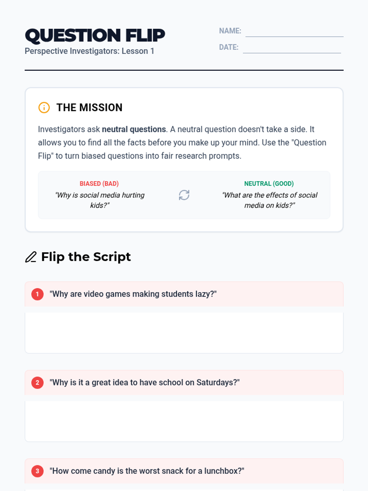 This inquiry-based sequence teaches 4th-grade students to broaden their research to include multiple viewpoints. Students move from asking neutral questions to investigating both 'Pro' and 'Con' sides of an issue, evaluating evidence strength, and synthesizing their findings into a balanced report.