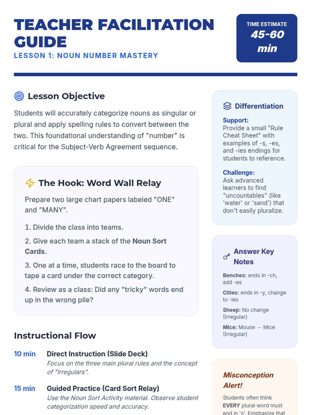 This sequence establishes the fundamental rules of subject-verb agreement for 4th graders, focusing on singular vs. plural subjects, action verb markers (the 'S-Switch'), irregular auxiliary verbs, and proofreading techniques. Students progress from simple noun categorization to complex sentence construction and error analysis.