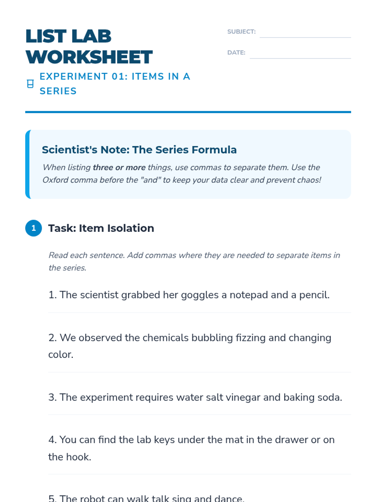 This sequence focuses on the critical role commas play in sentence structure and clarity, moving beyond simple listing. Students progress from introductory elements to compound structures and non-essential interrupters, culminating in a professional editing workshop.