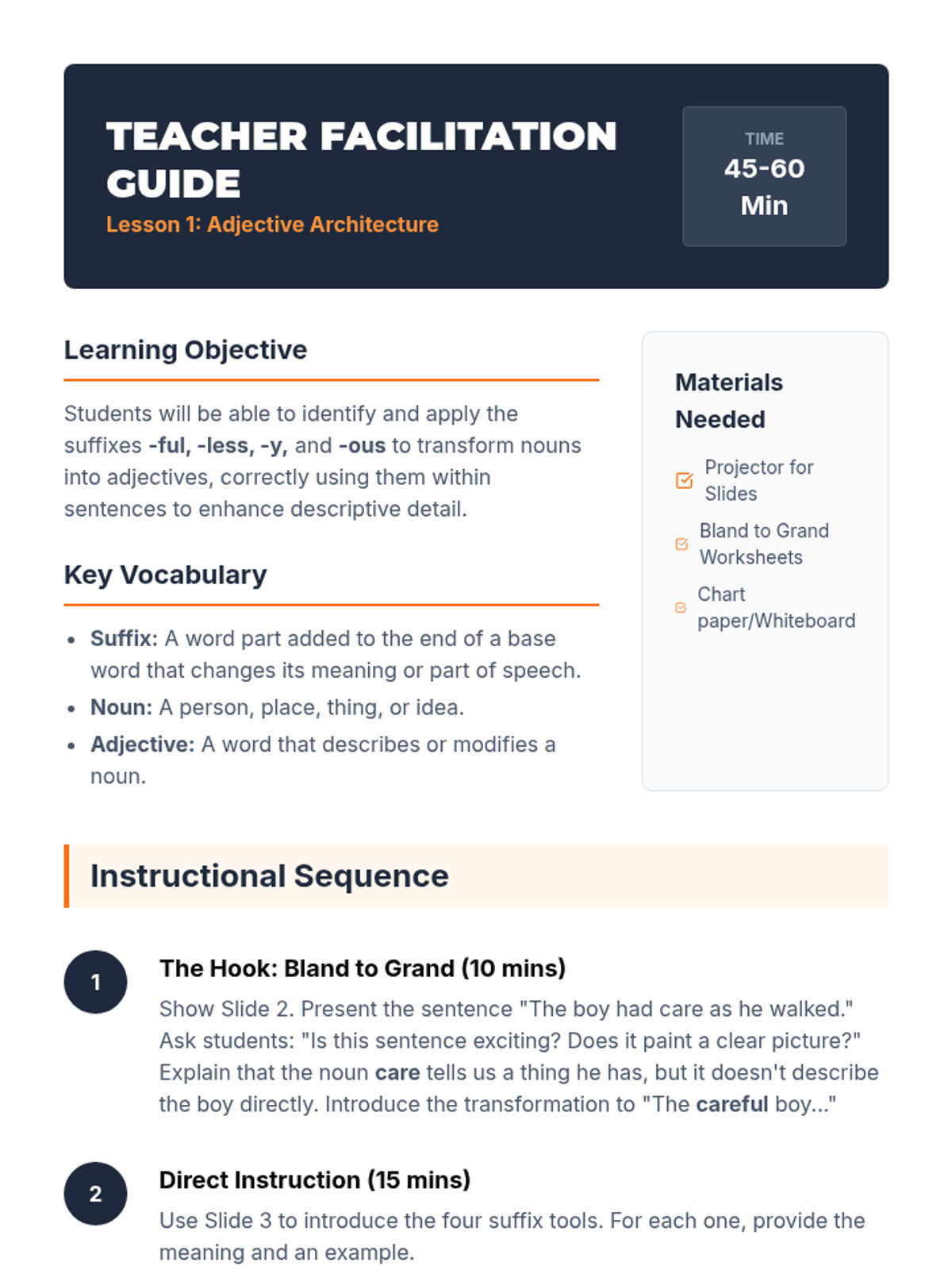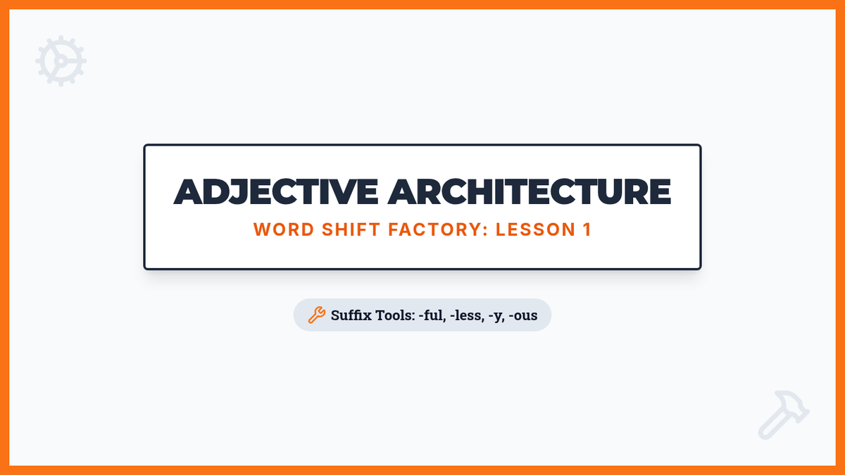 A 5-lesson sequence for 4th graders exploring how suffixes transform words between parts of speech. Students act as 'Word Engineers' to build, modify, and refine language.