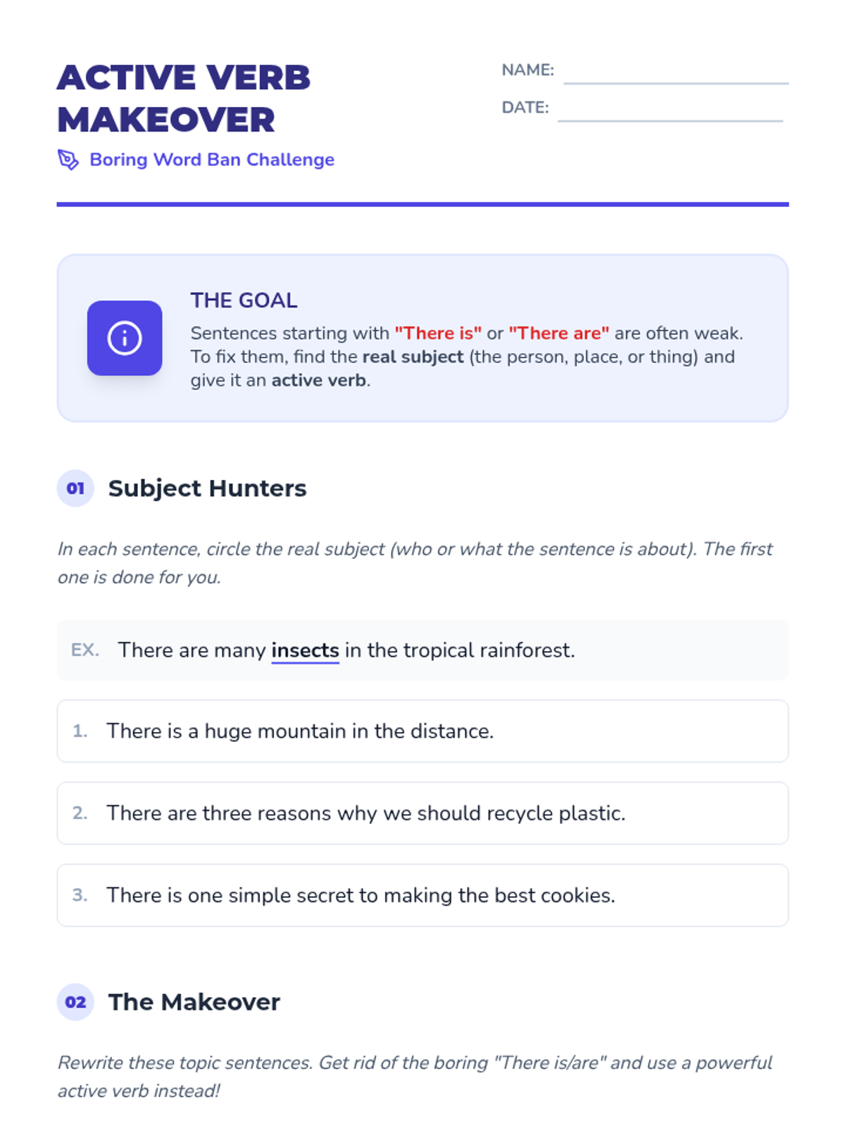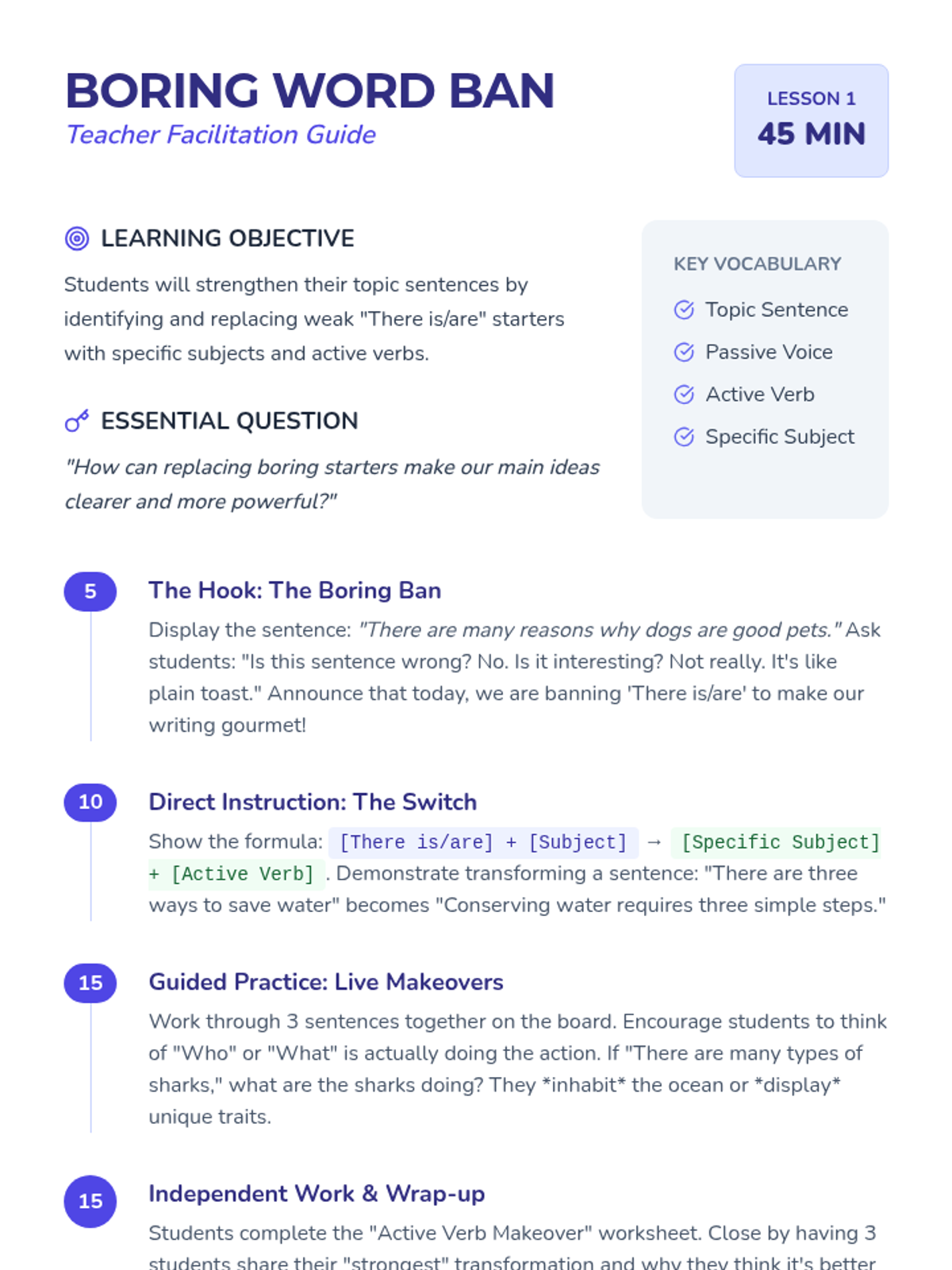 This project-based sequence applies verb knowledge to creative writing. Students focus on the stylistic impact of verbs, practicing how to shift tenses correctly within a narrative and how to replace weak 'to be' verbs with vivid action. The sequence culminates in a polished narrative piece that demonstrates mastery of tense consistency and strong verb choice.