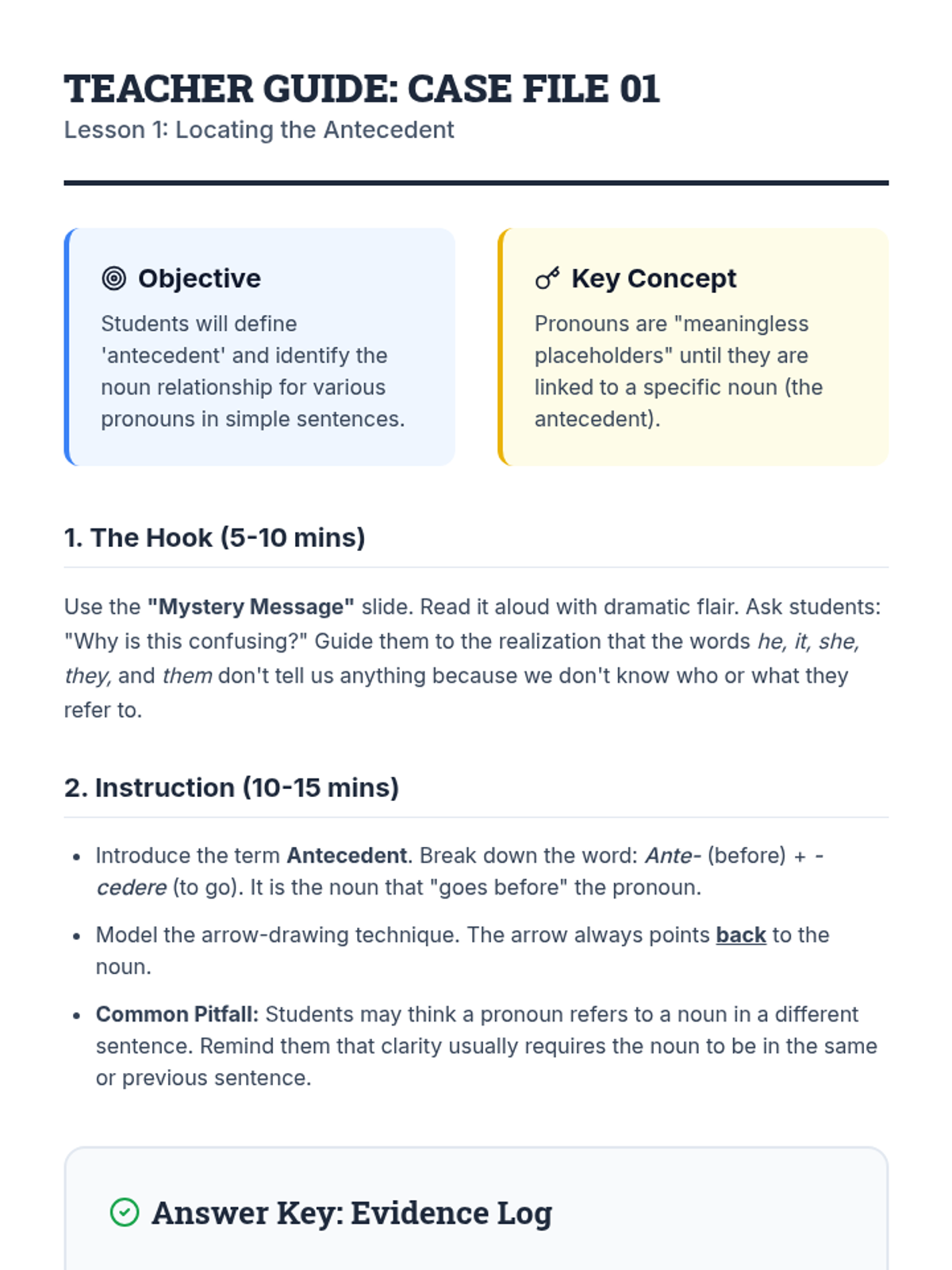 This workshop-style sequence focuses on the logical relationship between pronouns and their antecedents to ensure clarity in writing. Students move from simple identification to solving complex ambiguity and distant antecedent problems, culminating in a professional editing simulation.