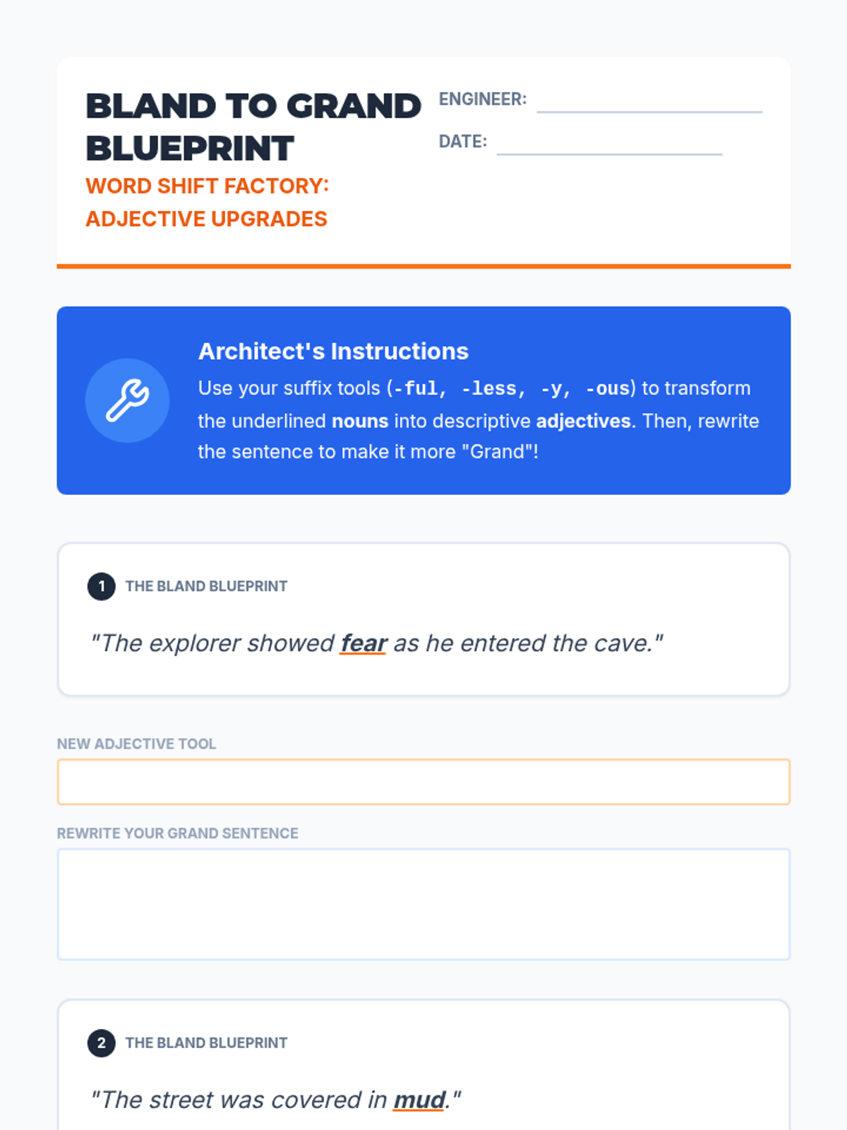 Students embark on a journey of fictional world-building, using precise nouns and vivid adjectives as their primary tools. They move from character identity to atmospheric settings, eventually crafting a polished narrative passage that demonstrates the power of descriptive imagery.