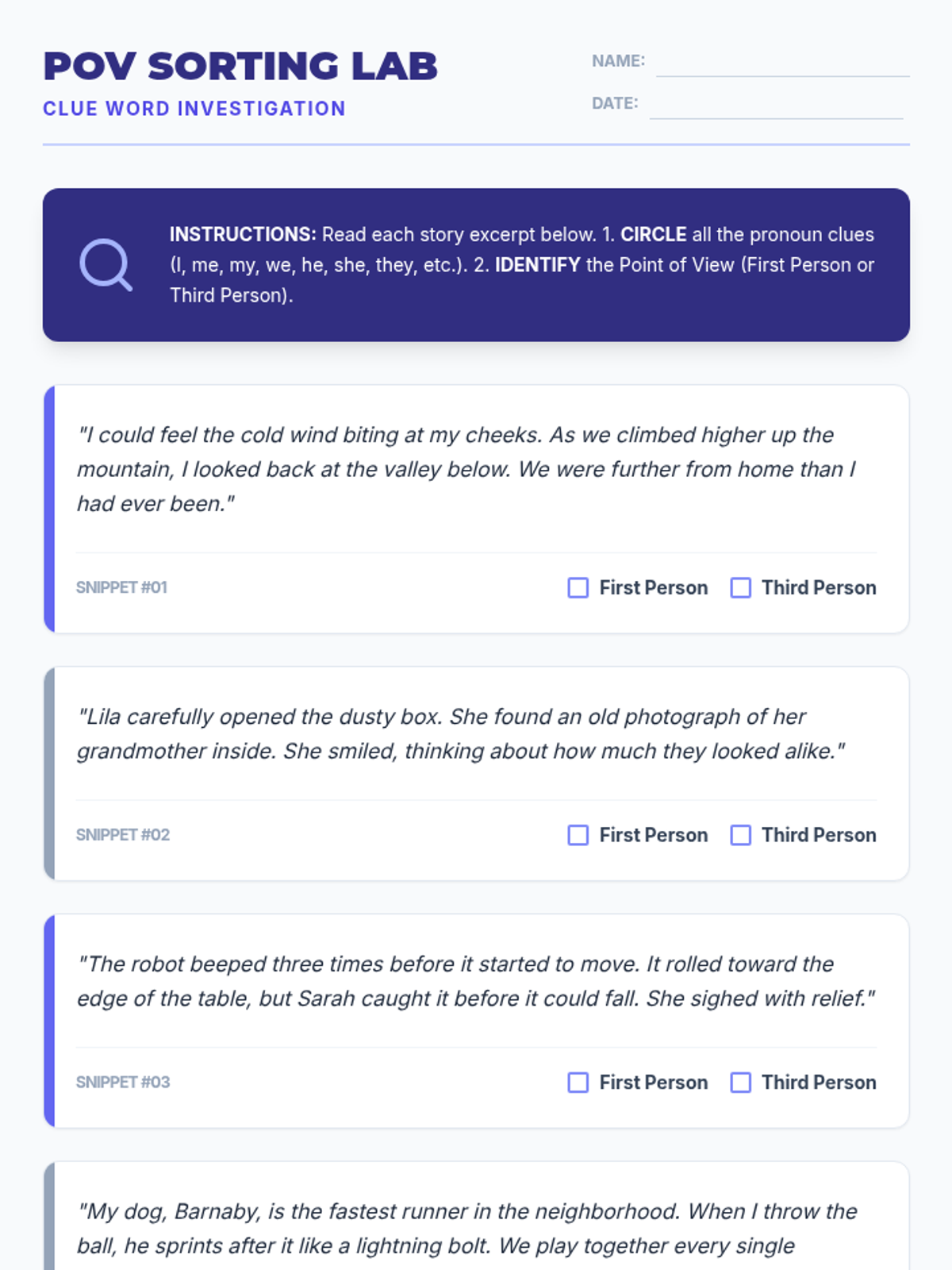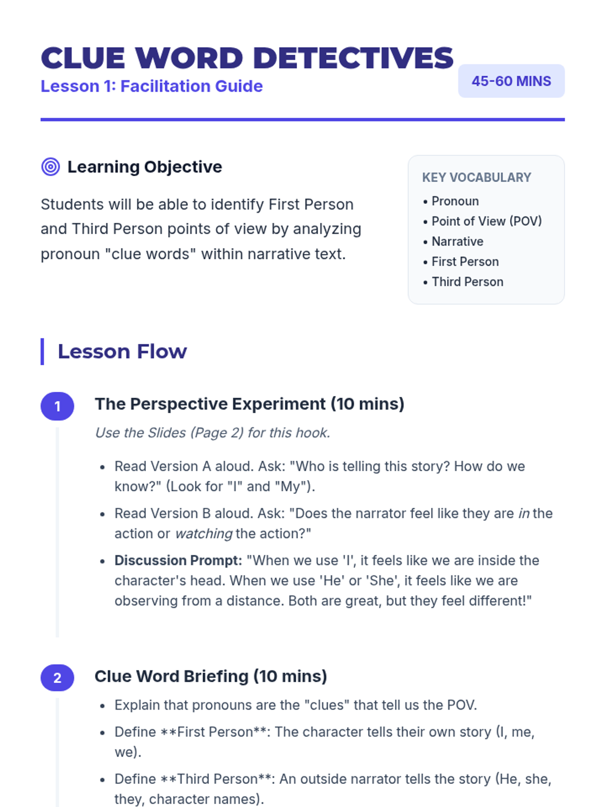 A 5-lesson sequence for 4th graders that bridges grammar and narrative writing. Students explore first and third-person perspectives, practice pronoun consistency, master pronouns in dialogue, and complete a final perspective-shift writing project.