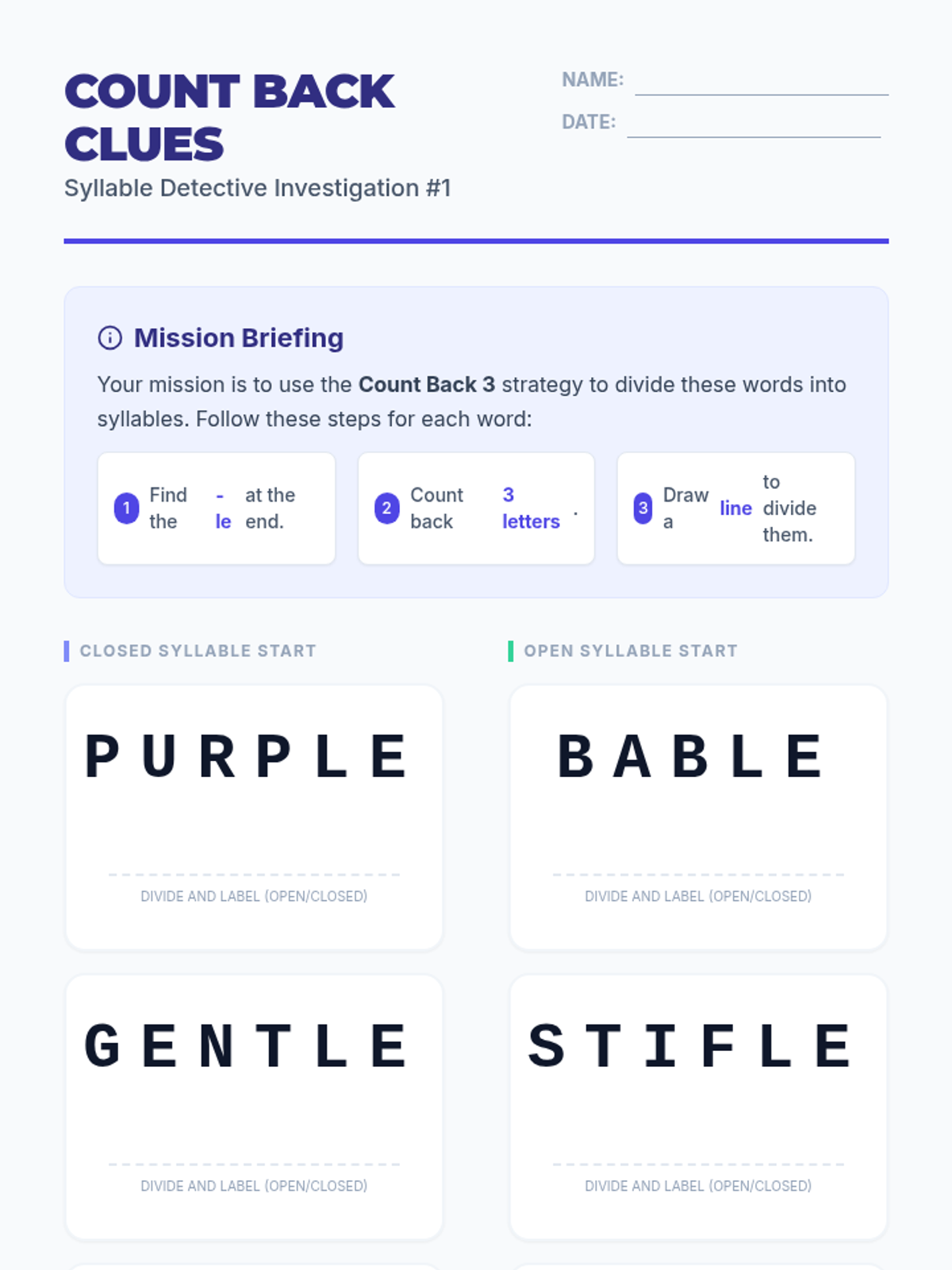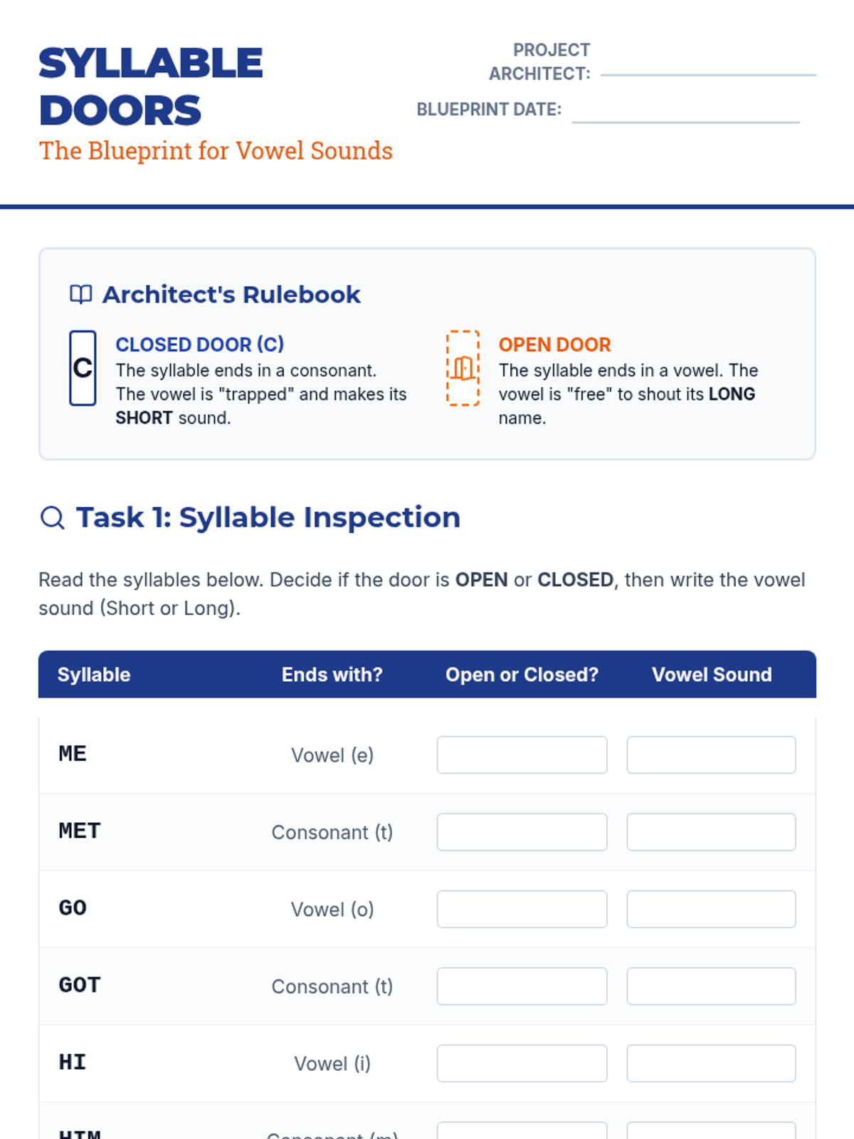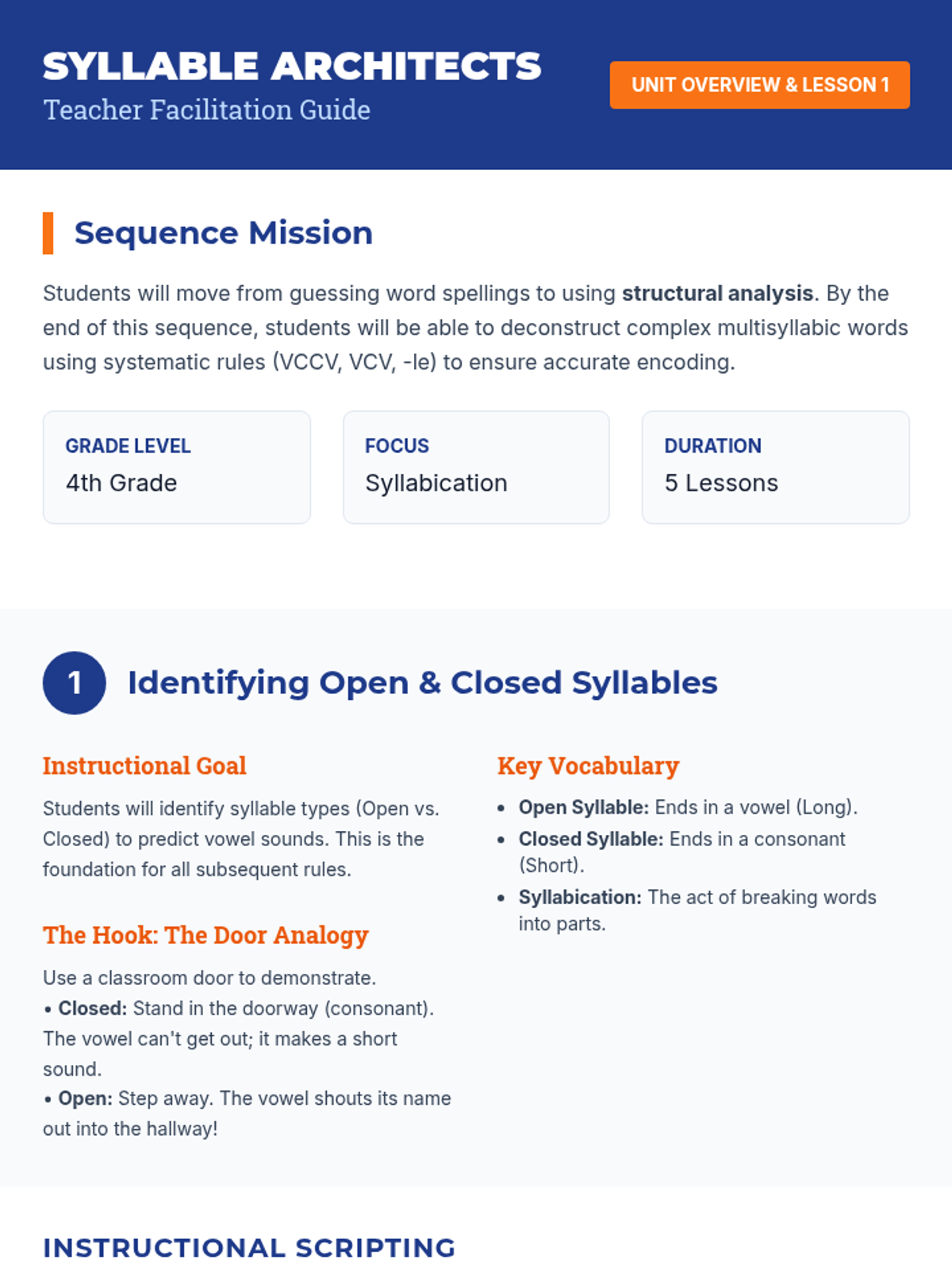 A systematic spelling sequence focused on syllabication strategies (VCCV, VCV, -le) to help 4th-grade students decode and encode multisyllabic words with confidence. Students use the 'Syllable Architects' theme to 'build' and 'deconstruct' words using structural analysis.
