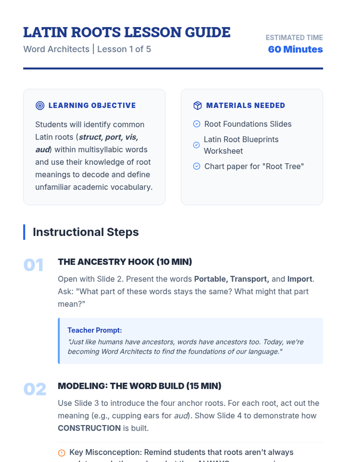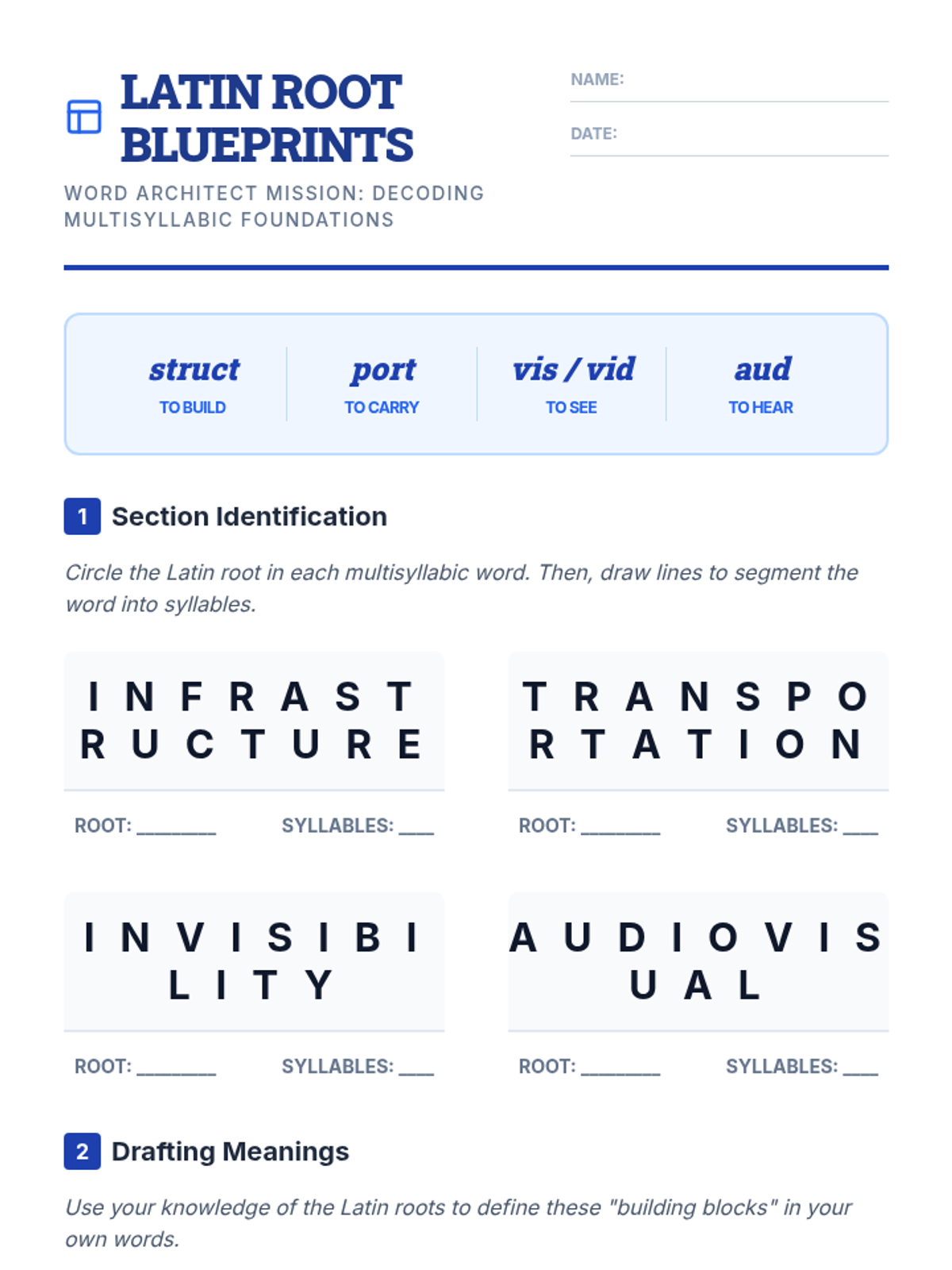 A project-based sequence for 4th graders to master multisyllabic words by exploring Greek and Latin roots. Students act as 'Word Architects' to decode complex academic vocabulary and create their own root-based inventions.
