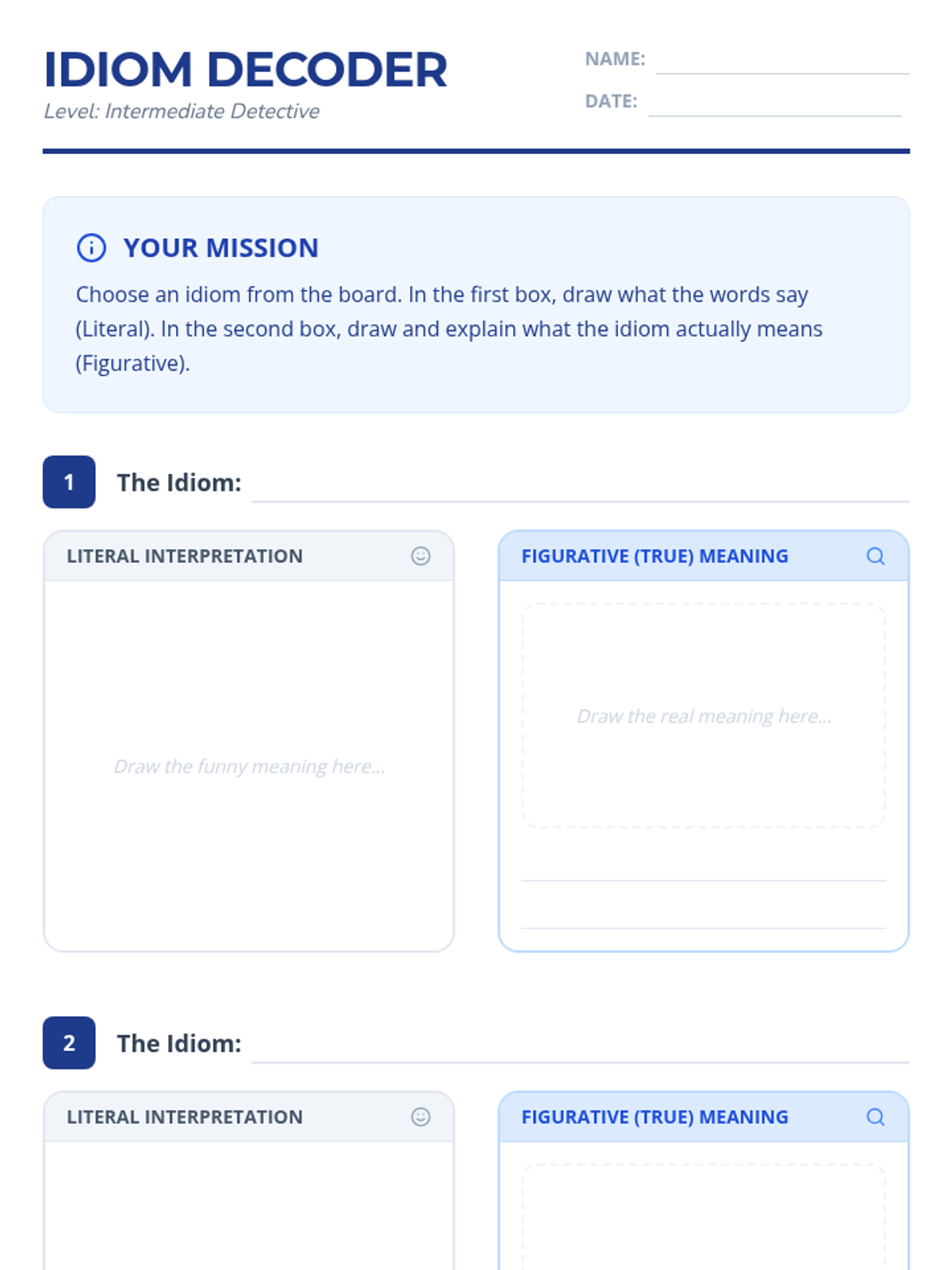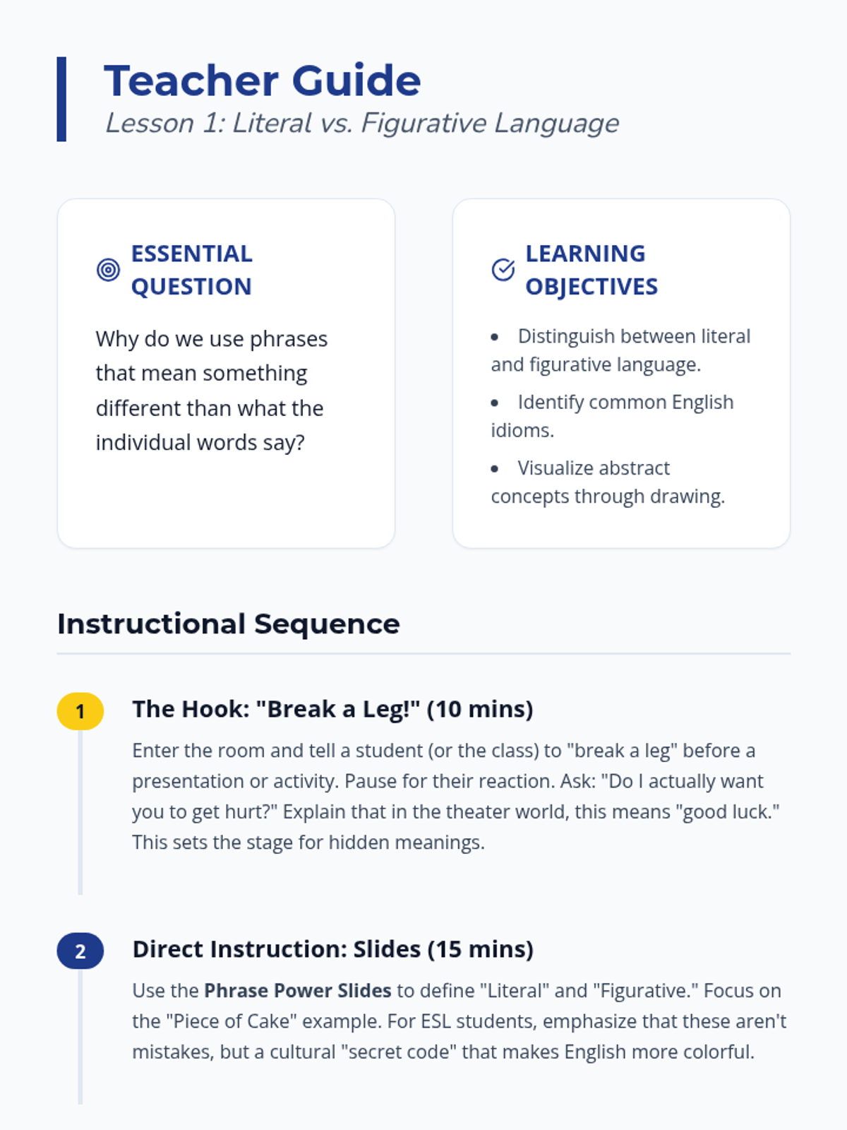 A 5-lesson unit for intermediate ESL students to master English idioms through visualization, categorization, and narrative performance. Students transition from understanding literal vs. figurative meanings to performing original skits that use idioms naturally.