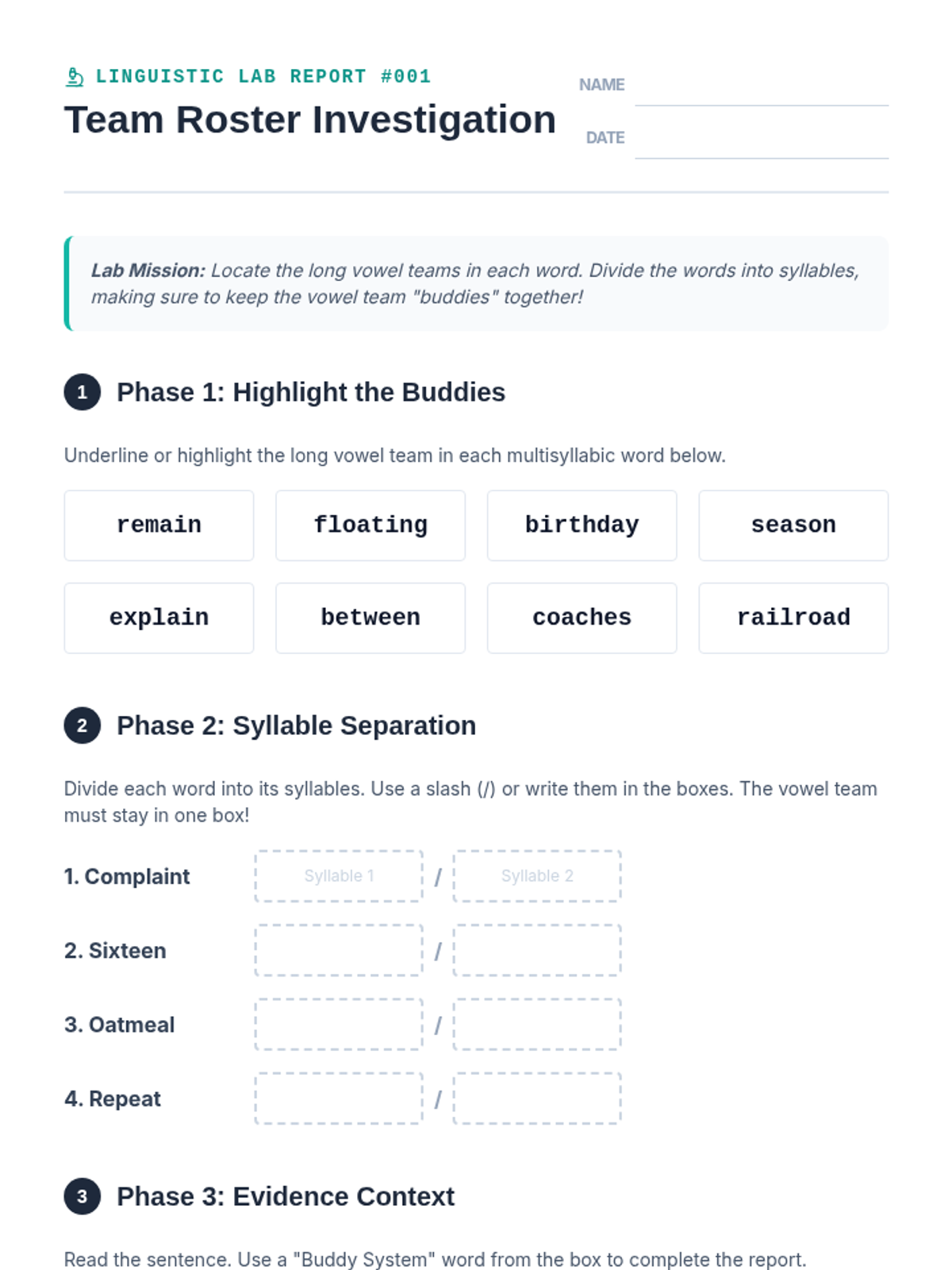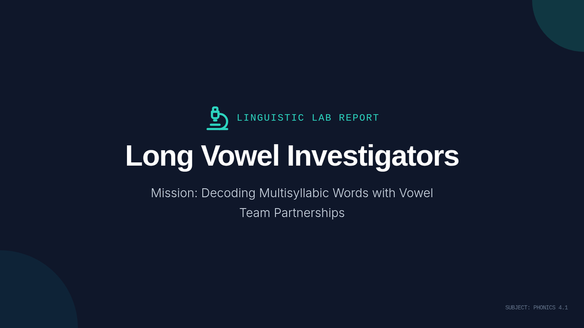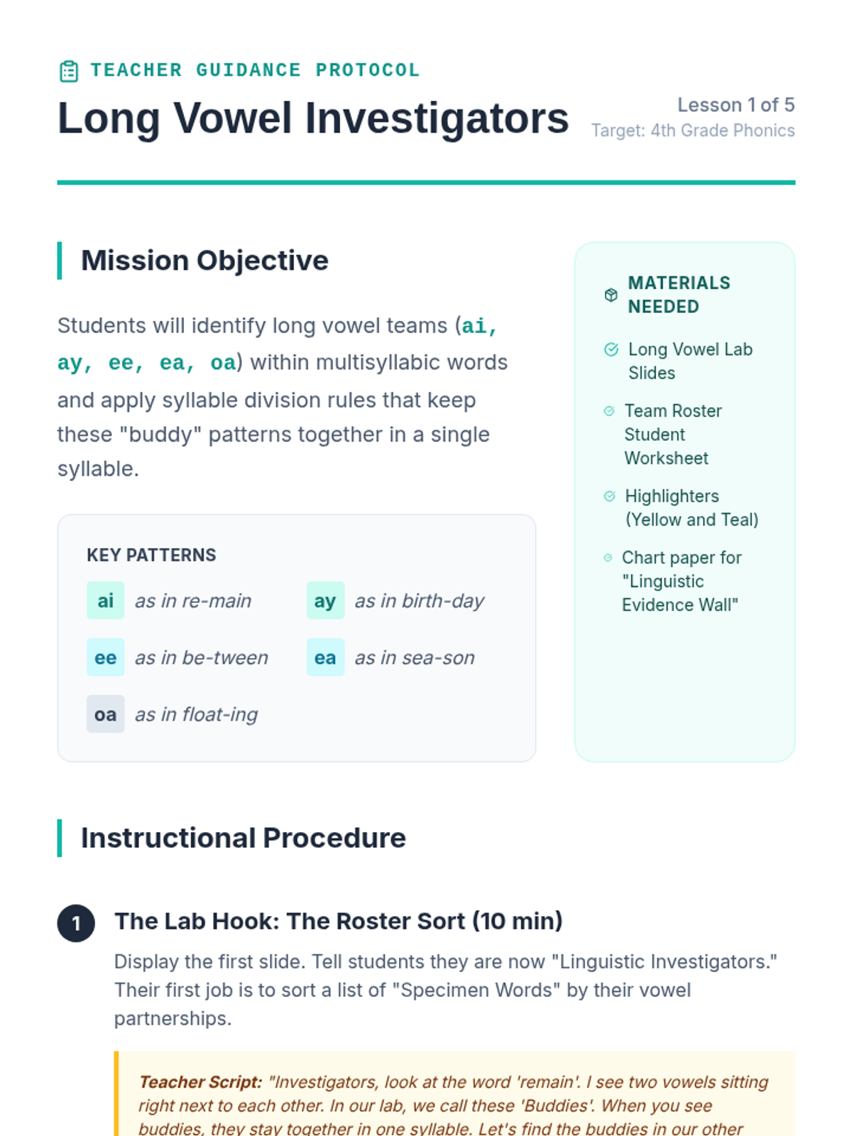 A comprehensive 4th-grade sequence focusing on decoding multisyllabic words using vowel teams and r-controlled patterns through a 'Linguistic Lab' detective theme.