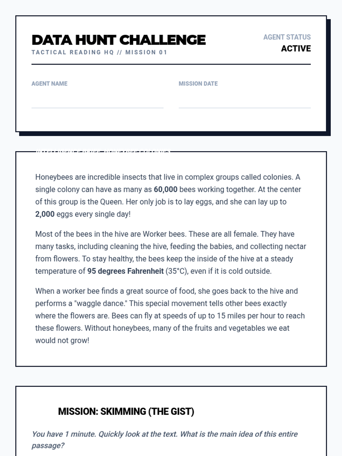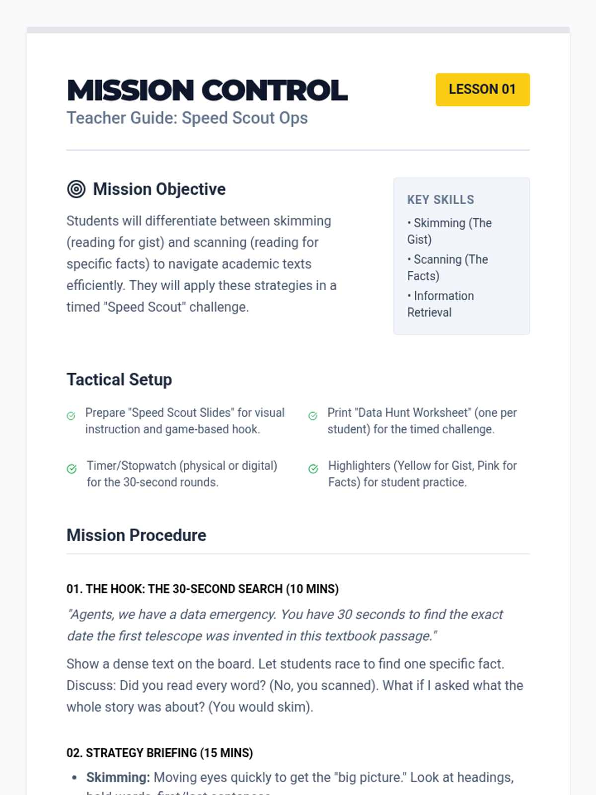 This sequence teaches 6th-grade ESL students the essential test-taking strategies of skimming and scanning. Through a 'Speed Scout' academy theme, students learn to navigate academic texts efficiently, identifying when to look for the 'gist' versus specific details to save time and improve accuracy on standardized tests.