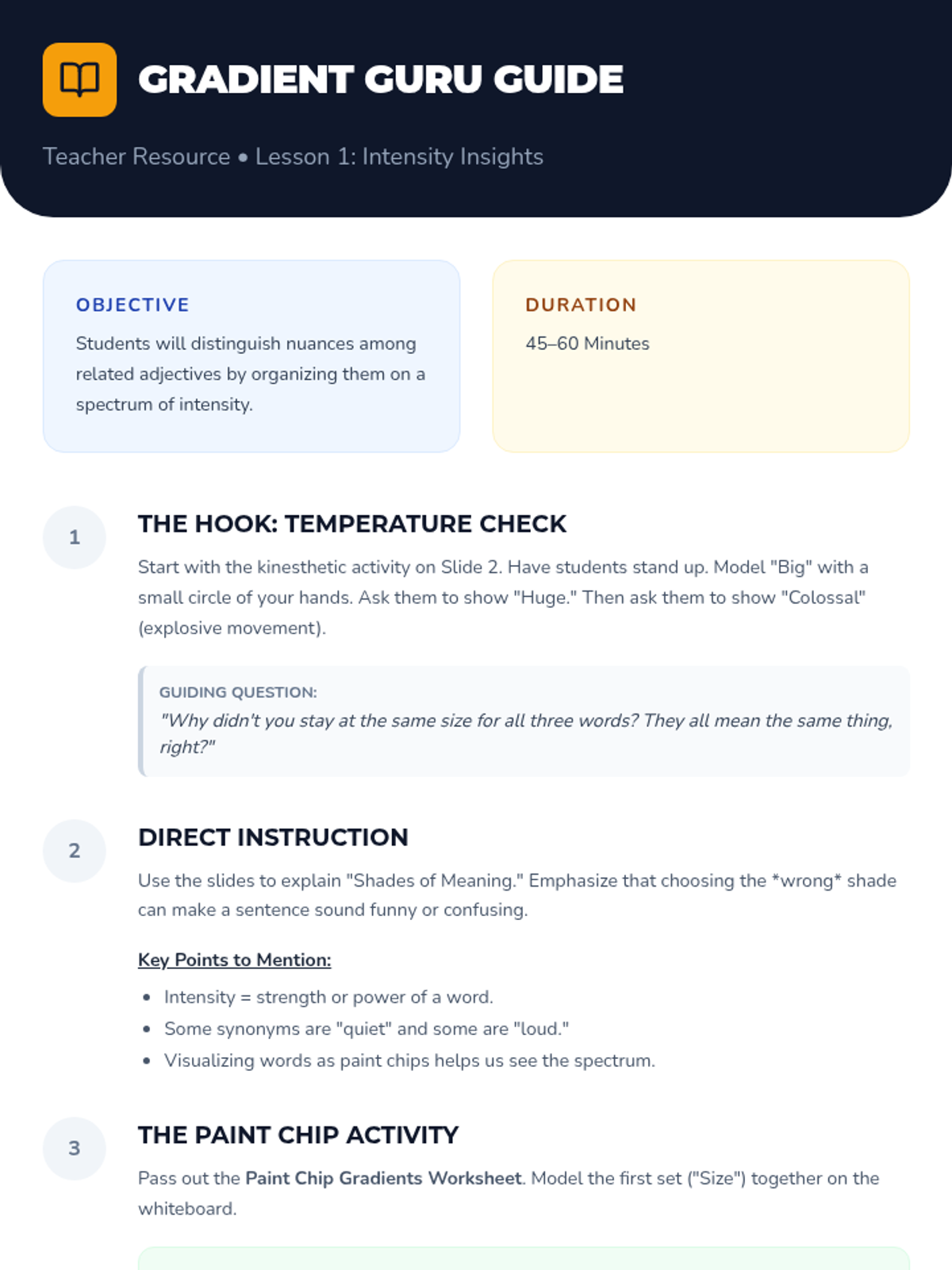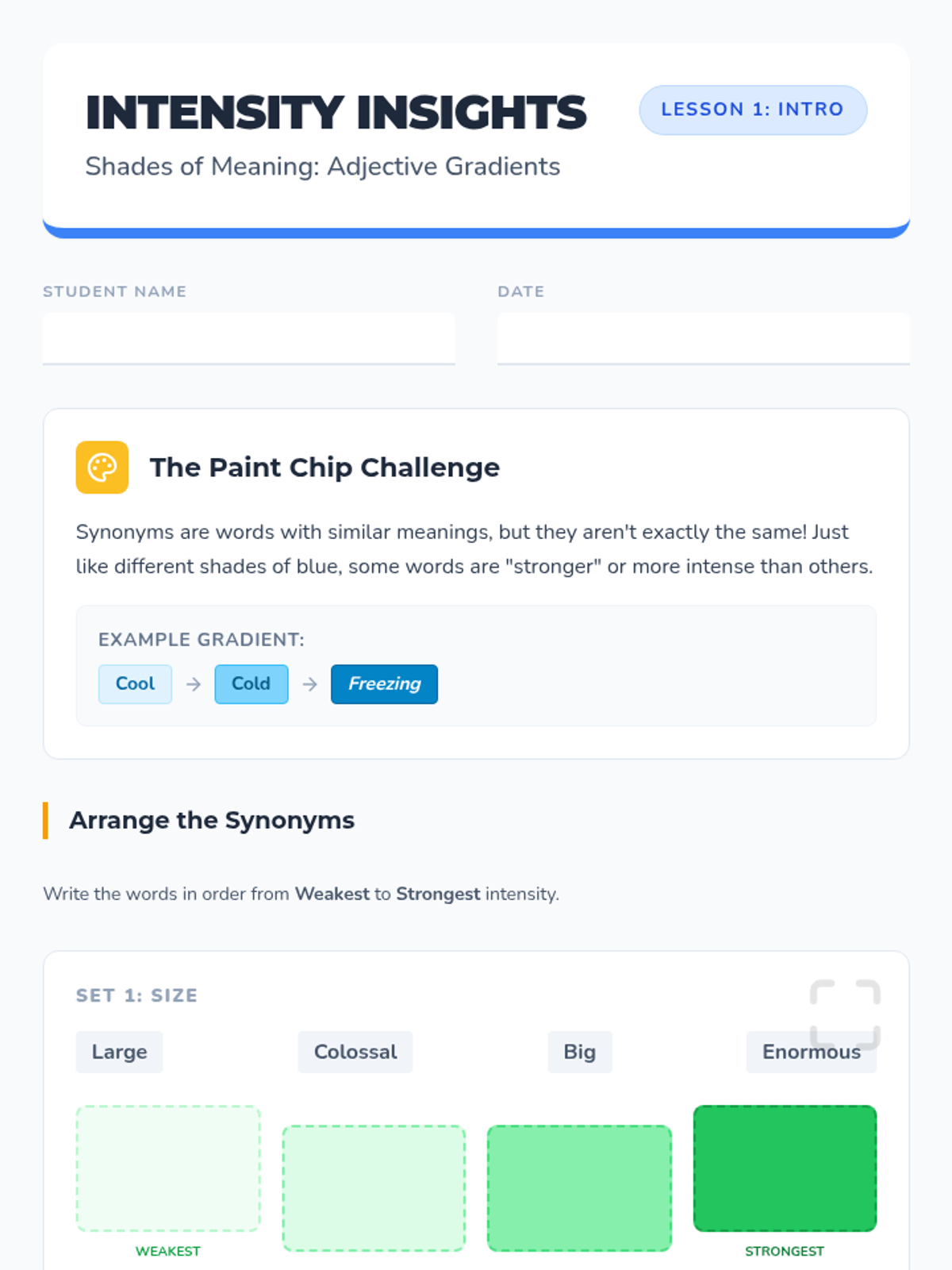 A 5-lesson sequence for 4th-grade students to explore shades of meaning, synonym intensity, and word connotations. Students move from physical gradients to dramatizing verbs and finally to revising writing for precision.