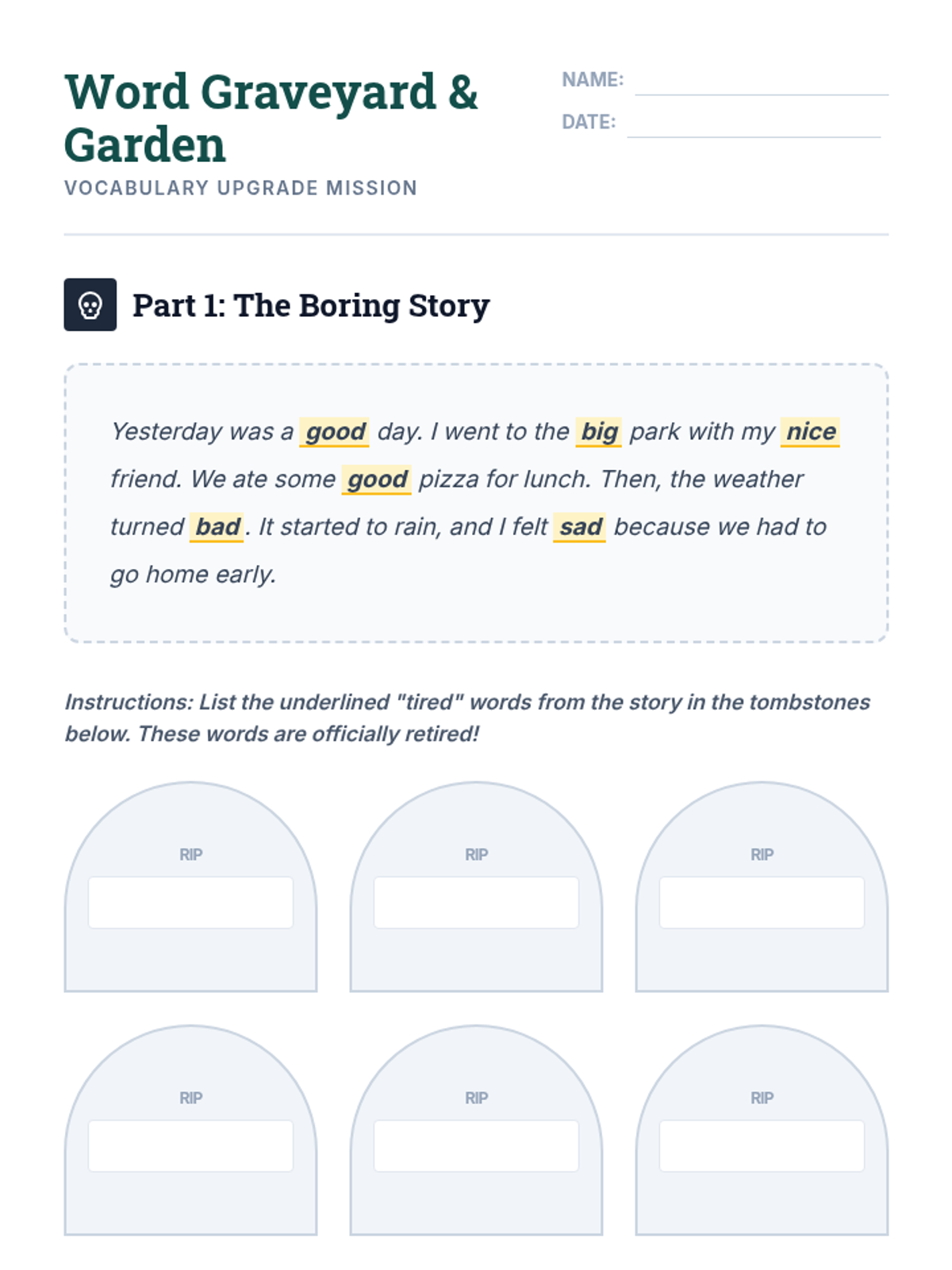 This sequence guides 4th-grade intermediate ESL students through the process of upgrading their narrative writing by replacing 'tired' adjectives with precise synonyms and mastering the use of phrasal verbs to describe actions more vividly. Students move from word-level upgrades to complex grammatical structures like separable phrasal verbs, culminating in a revision workshop.