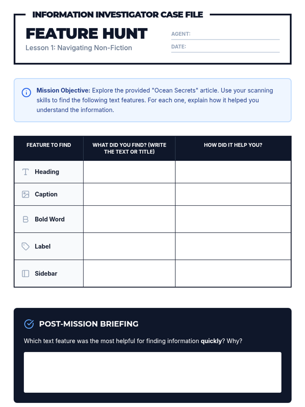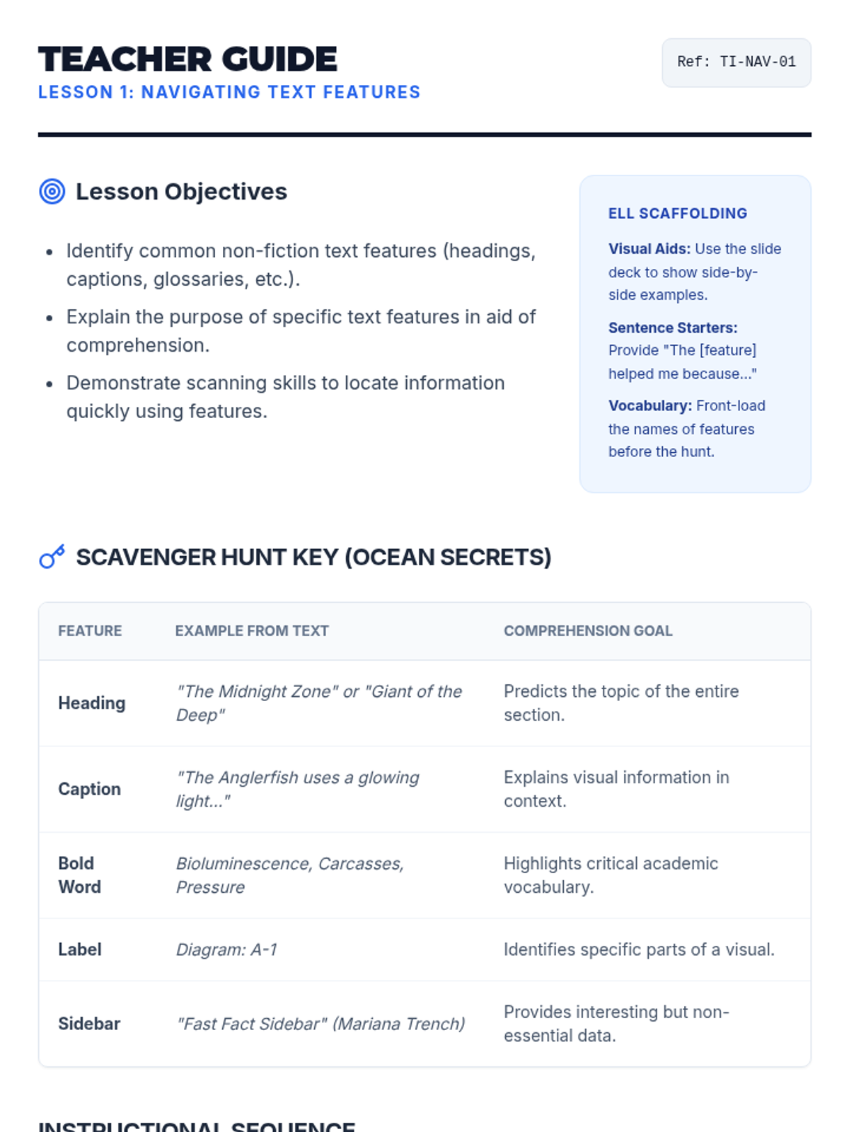 A comprehensive sequence for 4th Grade ELL students to master information synthesis, moving from text feature identification to combining multiple sources into a cohesive summary. Students act as 'Information Investigators' to build academic study skills.