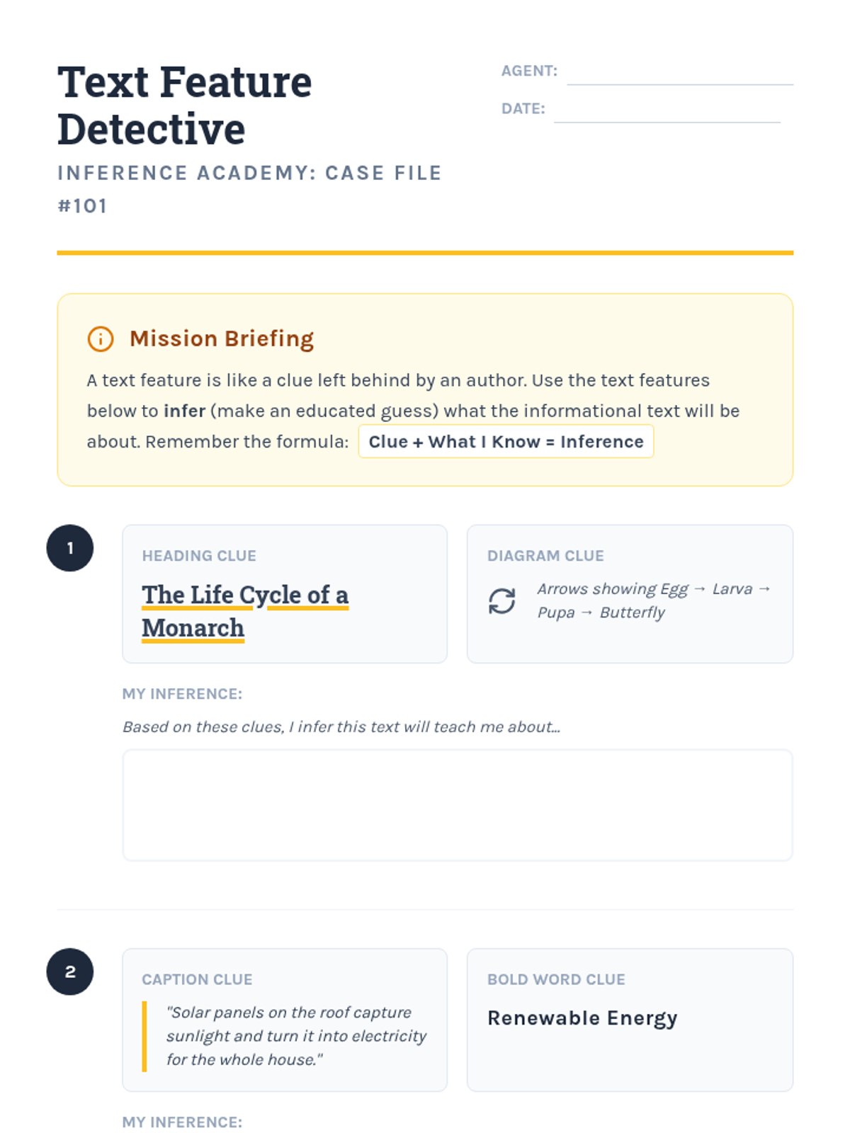 A comprehensive sequence for 4th-grade students to master making inferences in nonfiction. Students act as researchers to uncover hidden meanings, vocabulary, and authorial intent across five inquiry-based lessons.