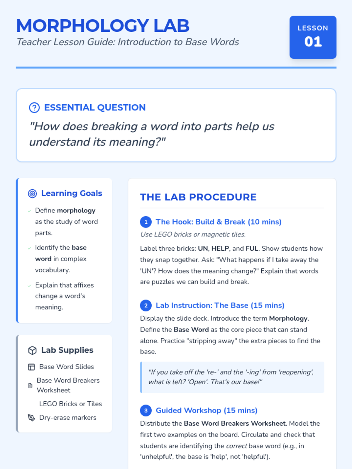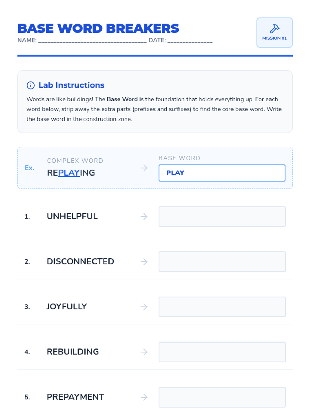 A comprehensive unit on word morphology for 4th graders, focusing on breaking words into base words, prefixes, and suffixes to unlock meaning and master spelling rules.