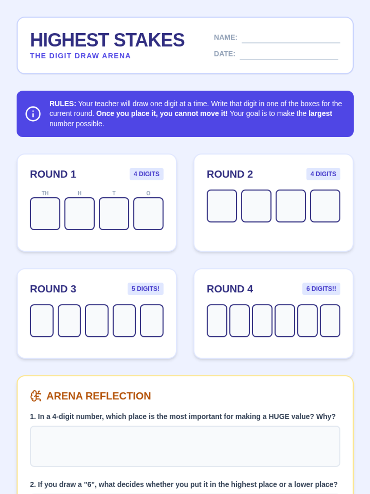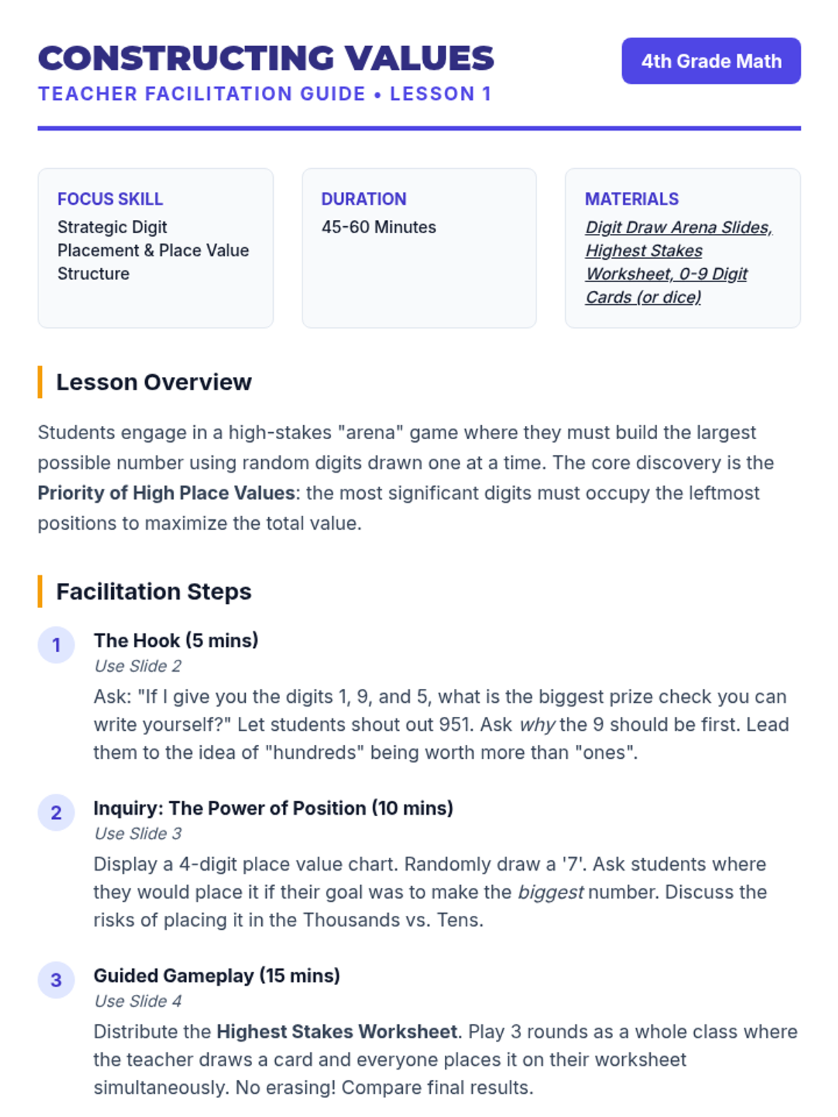 A game-based sequence where 4th-grade students master multi-digit number comparison through strategic placement, competitive card games, and game design. Students move from basic place value understanding to strategic probability assessments in order to maximize or minimize numerical values.