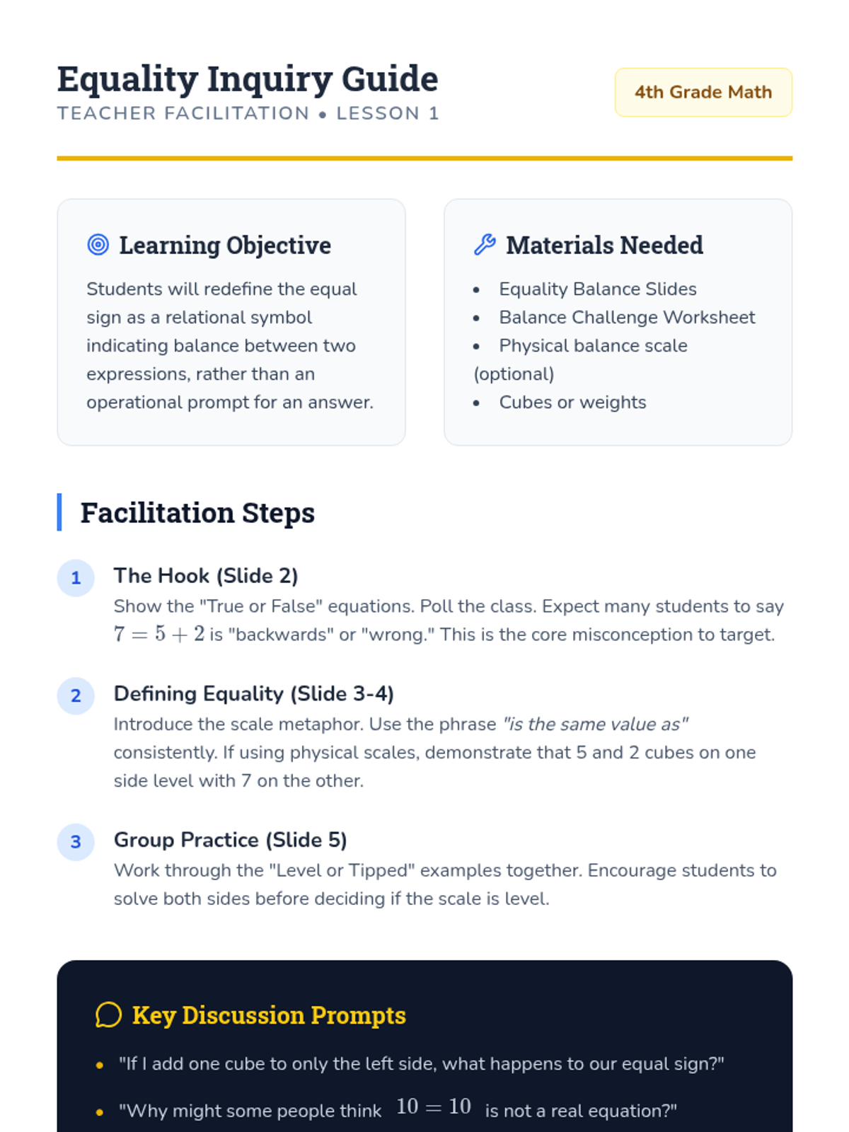 A 4th-grade math sequence focusing on the concept of equality as balance. Students move from concrete representations of balance scales to abstract algebraic equations using addition and subtraction.