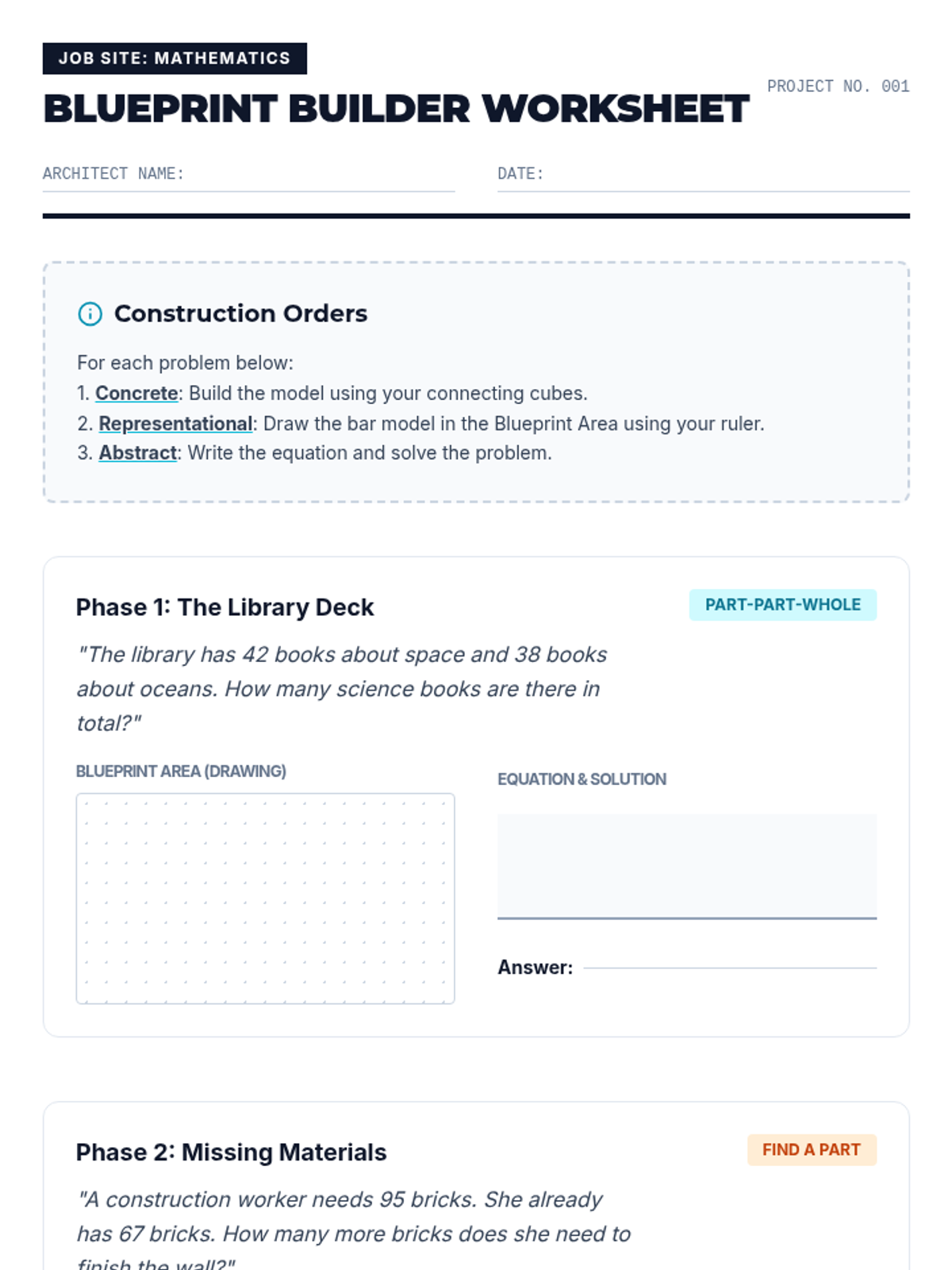 This 3rd-grade sequence introduces the Concrete-Representational-Abstract (CRA) framework using bar models (tape diagrams) to visualize additive relationships. Students transition from physical linking cubes to drawn rectangles, mastering part-part-whole and comparison models to decode and solve word problems.
