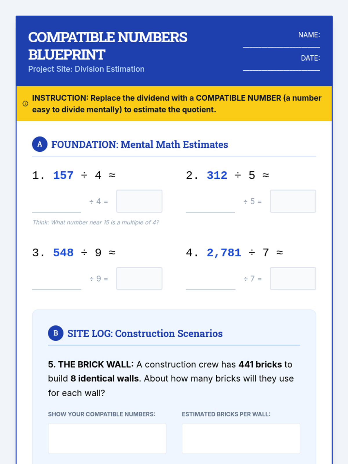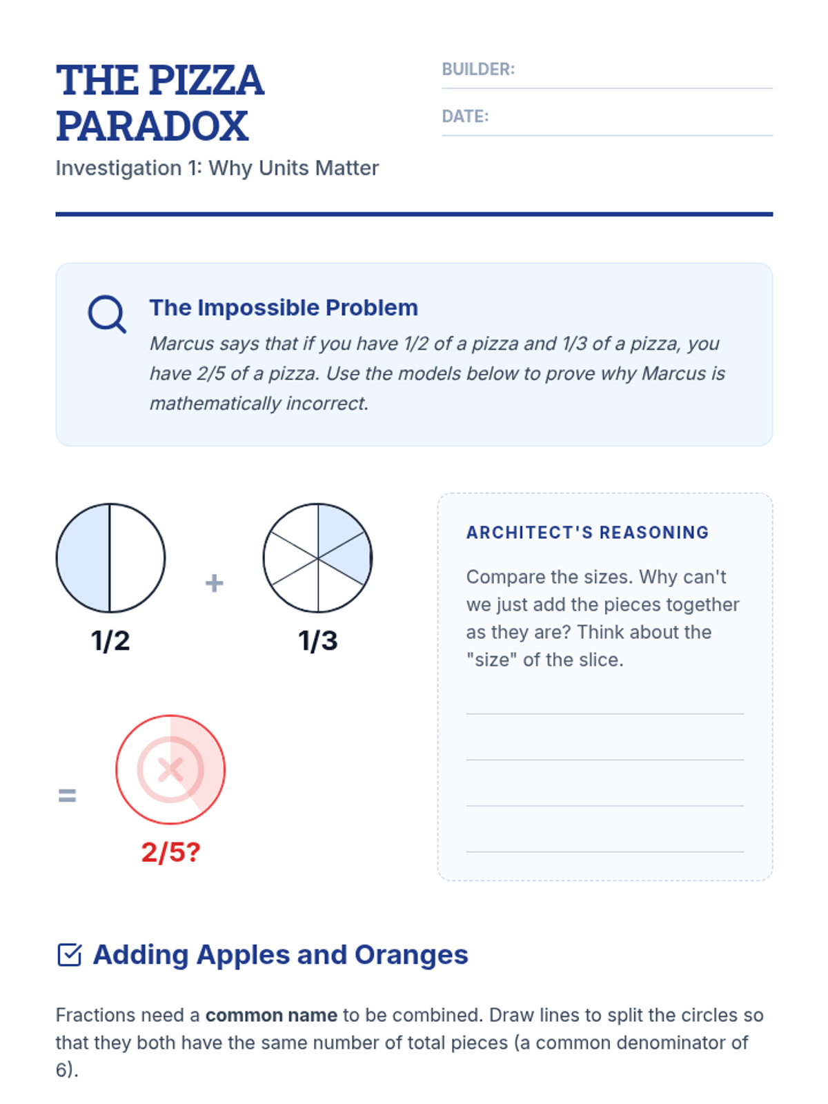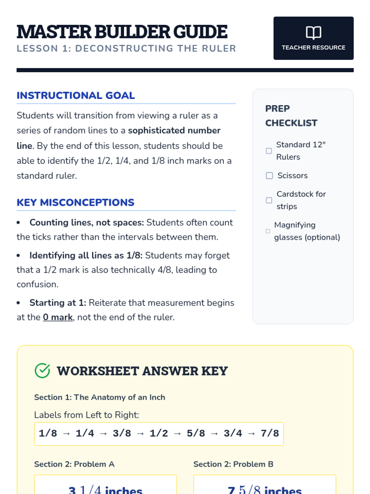 This sequence builds procedural fluency in adding and subtracting fractions and mixed numbers, transitioning from visual models to efficient algorithms using Least Common Multiples and regrouping. Students apply these skills in a culminating construction-themed project.