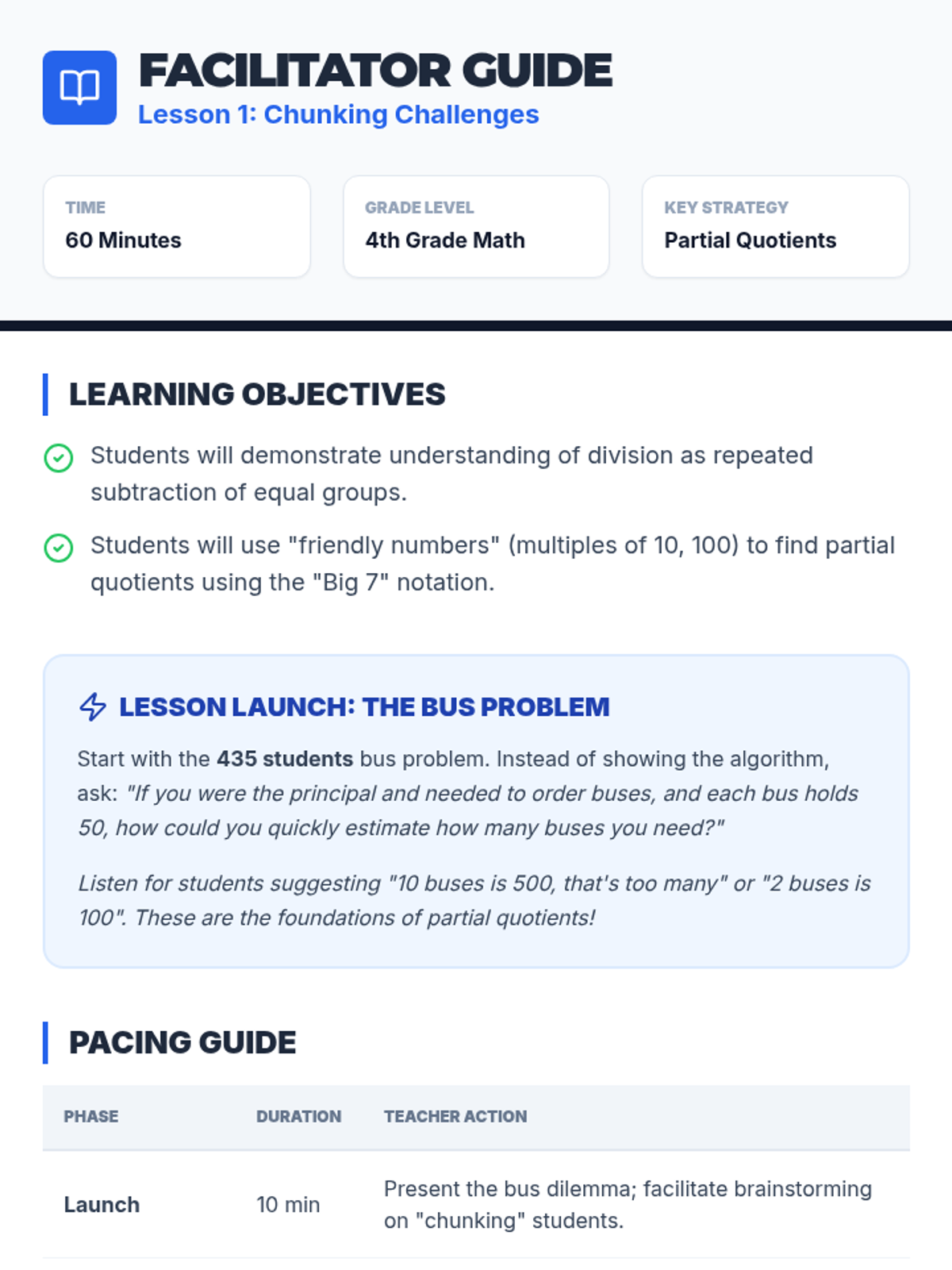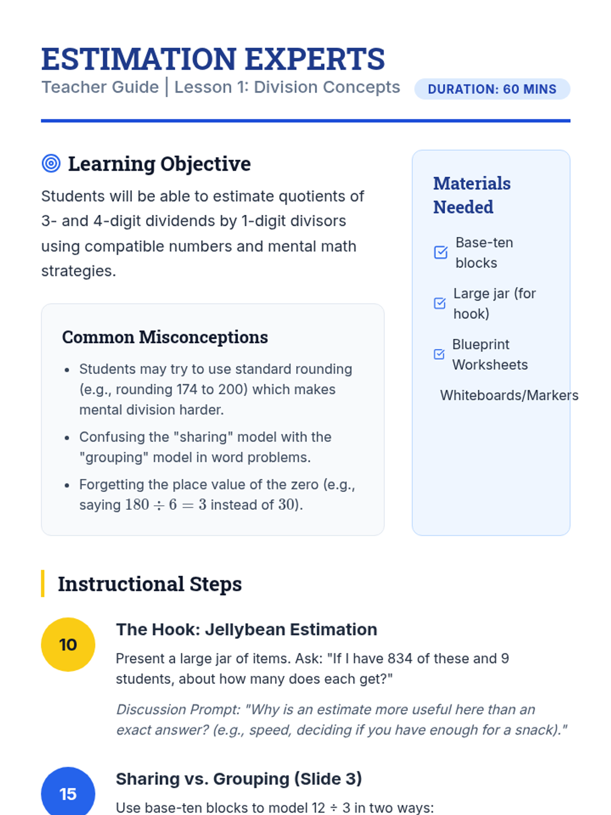 A 5-lesson sequence for 4th Grade students focused on transitioning from physical manipulatives to visual sketches using the Concrete-Representational-Abstract (CRA) framework. Students master arrays, area models for multiplication and fractions, and division sketches, culminating in a student-created visual strategy guide.