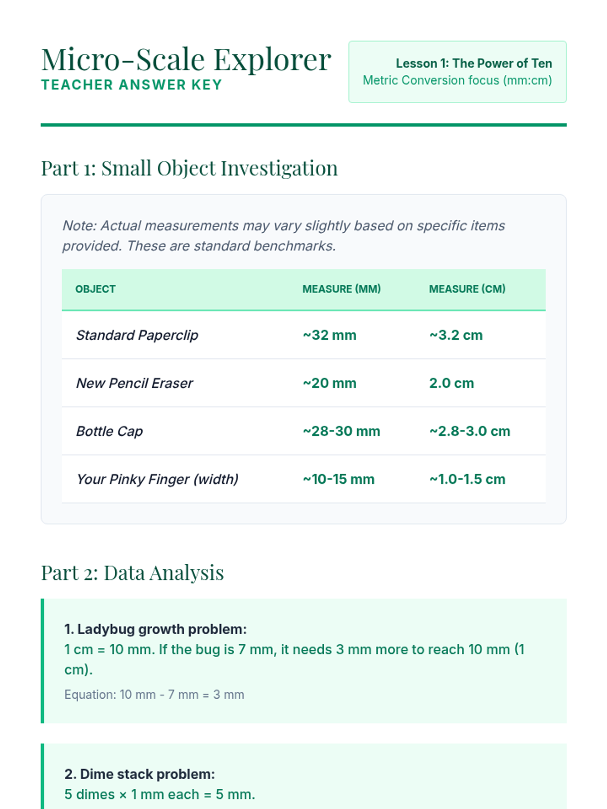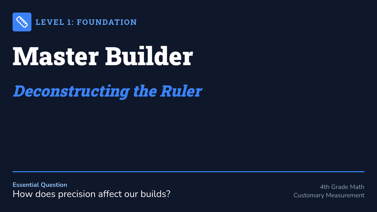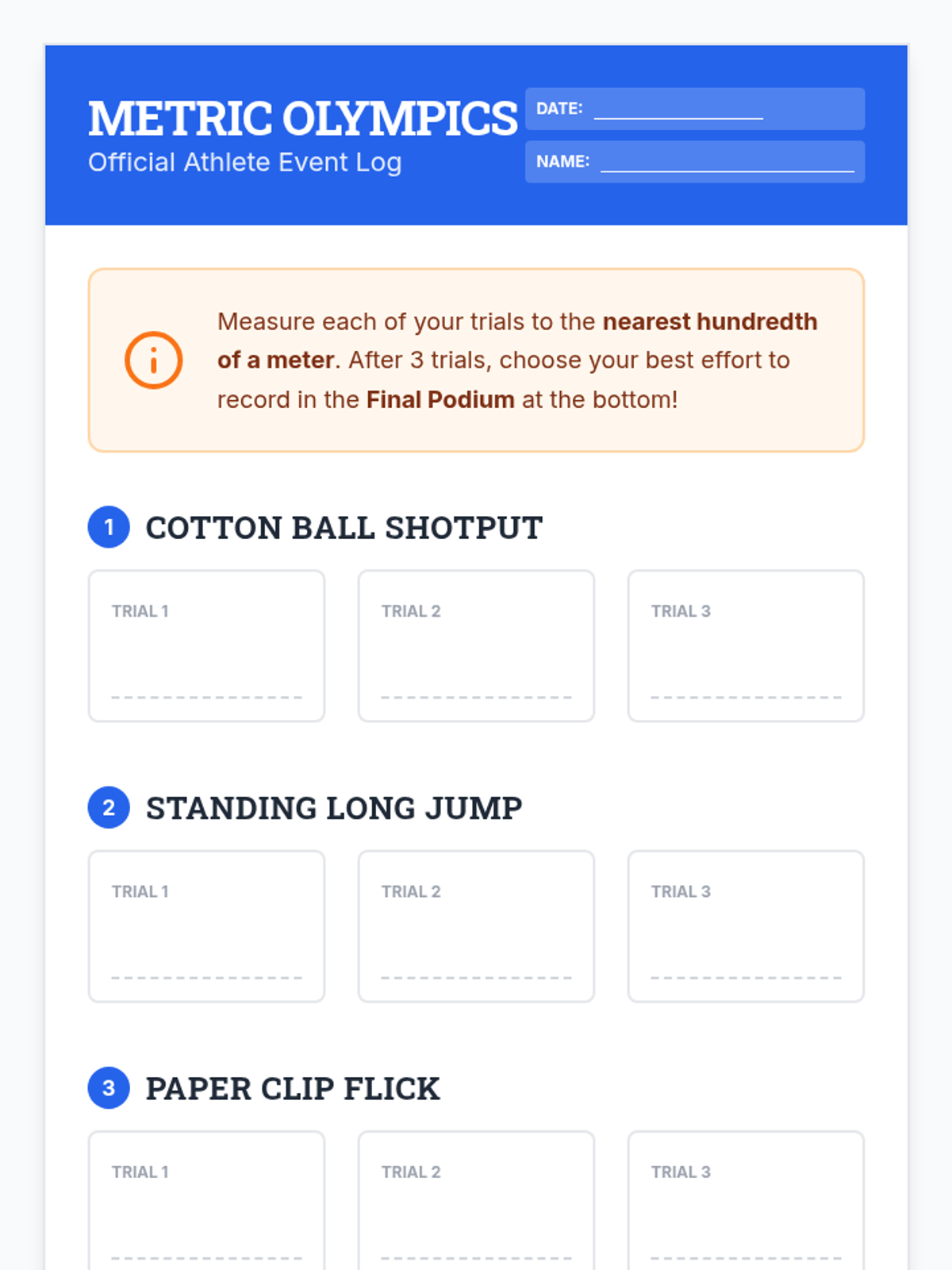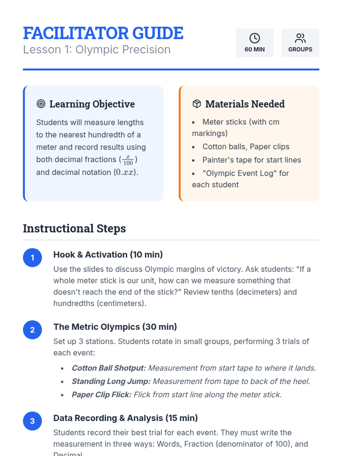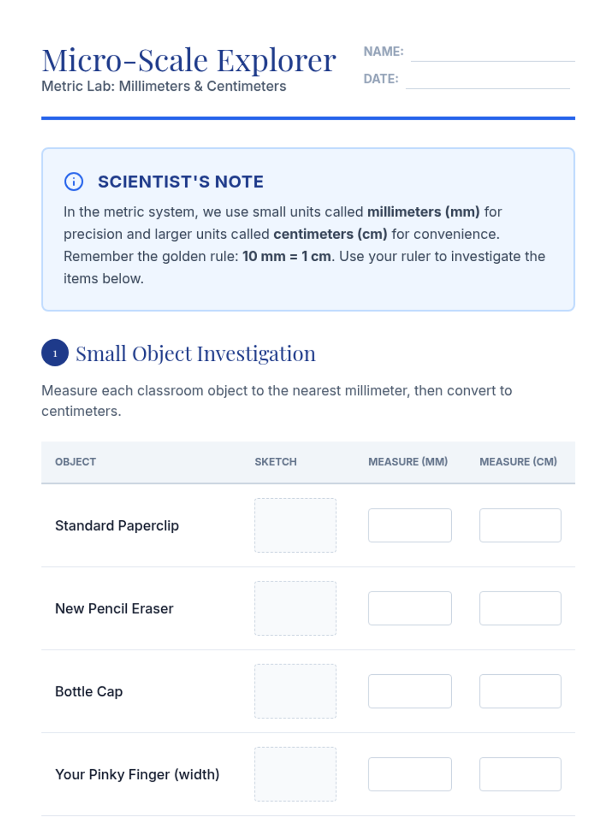 A comprehensive 5-lesson unit for 4th graders to master metric length measurement (mm, cm, m). Students transition from investigating micro-units on a ruler to measuring classroom-scale distances and conducting a 'Metric Olympics' to solidify their understanding of the base-ten measurement system.