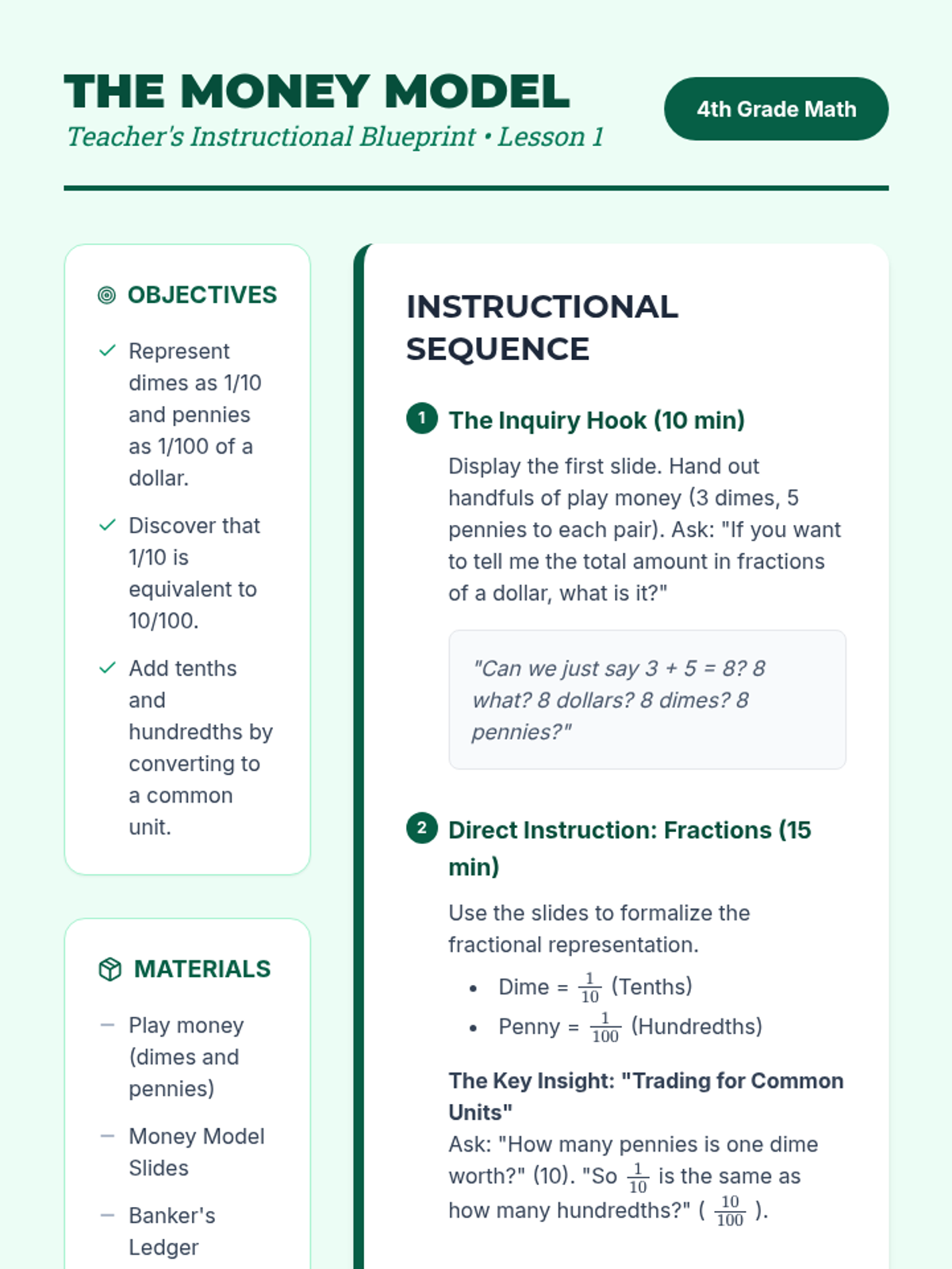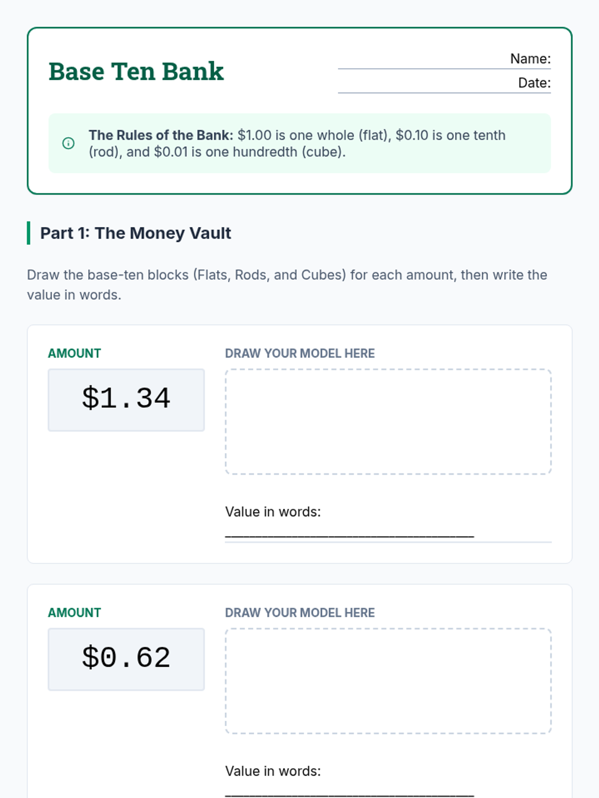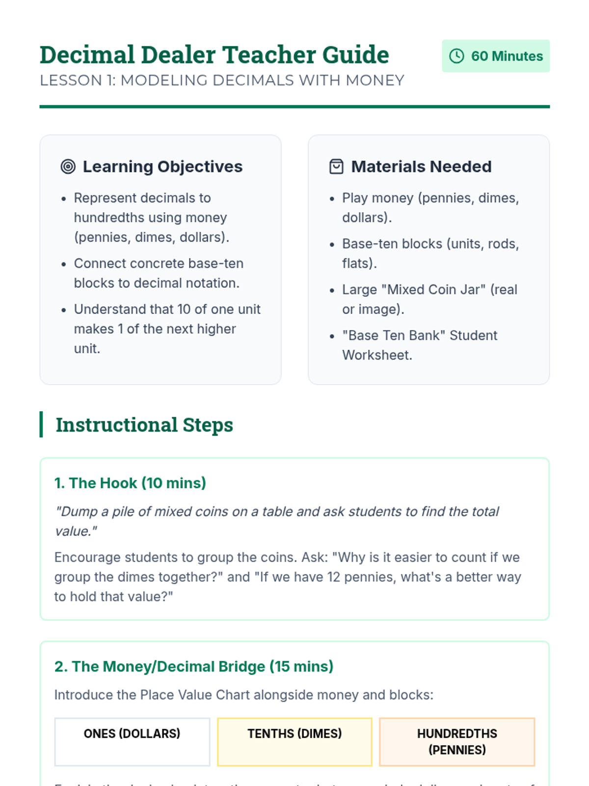 This sequence uses the Concrete-Representational-Abstract (CRA) framework to teach decimal place value through the lens of financial literacy. Students move from manipulating physical currency to drawing models and finally using standard algorithms to manage budgets.